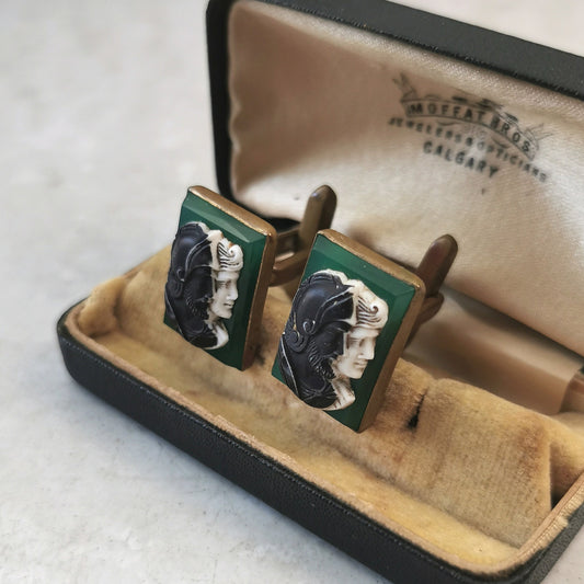 Vintage Brass & Glass Greek Warrior Cameo Cufflinks
