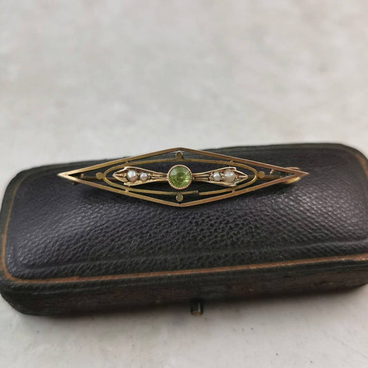 Edwardian 9ct Yellow Gold Peridot and Seed Pearl Bar Brooch