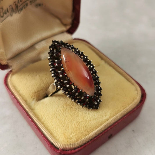 Bohemian 900 Silver Rose Cut Garnet Navette Ring