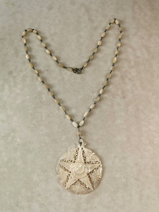 Art Deco Carved Mother of Pearl Pendant Necklace on Beaded Chain