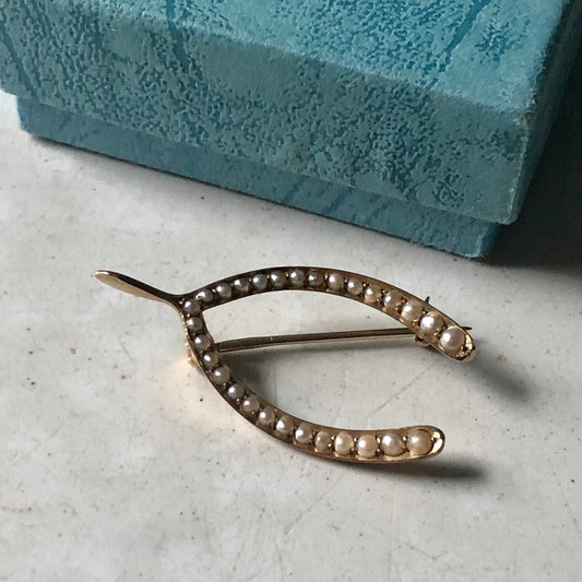 Edwardian 14k Yellow Gold & Seed Pearl Wishbone Brooch