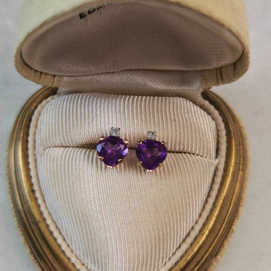 Estate 10k Yellow Gold Amethyst Heart and Diamond Studs