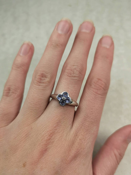 Estate 10k White Gold Tanzanite and Diamond Quatrefoil Flower Ring