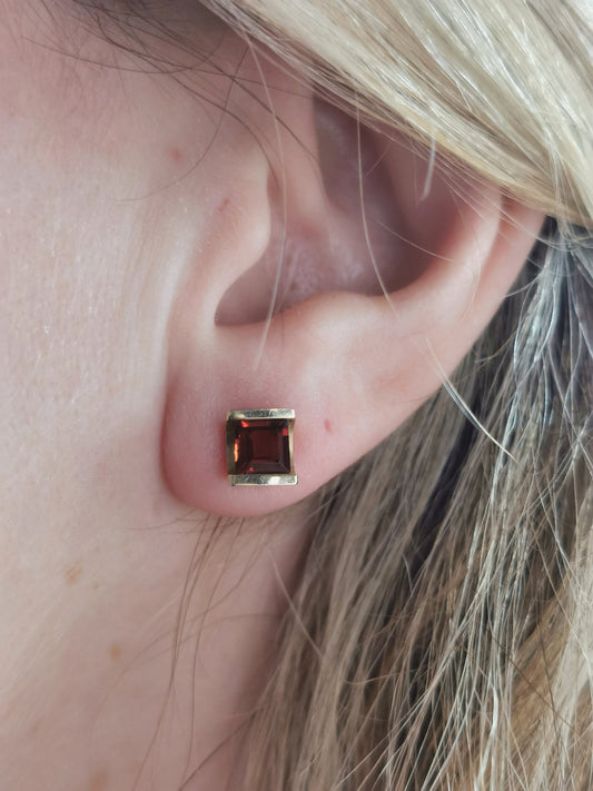 Estate 10k Yellow Gold Channel Set Princes Cut Garnet Stud Earrings