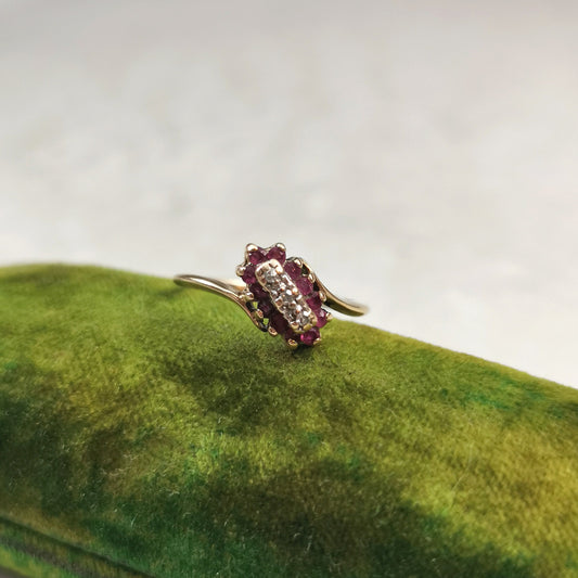 Estate 10k Yellow Gold Ruby & Diamond Cluster Bypass Ring