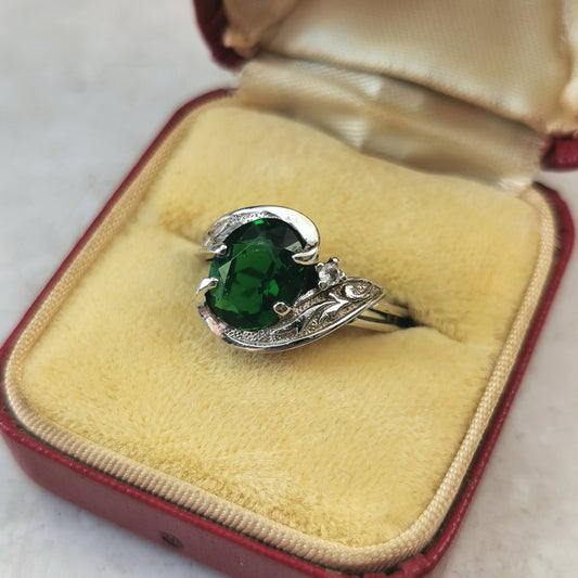 Estate 10k White Gold Synthetic Emerald Ring - Paste Stones