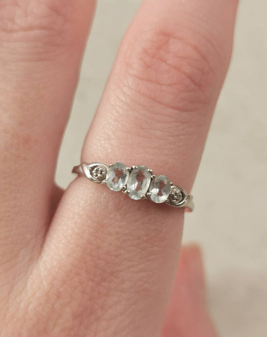 Estate 10k White Gold 3 Stone Aquamarine and Diamond Ring