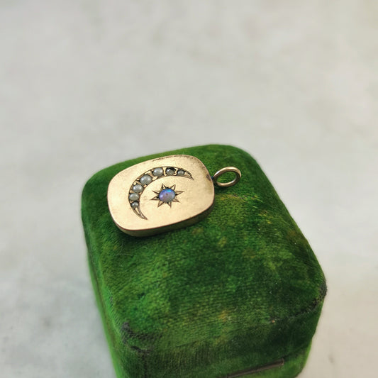 Victorian Gold Fill Seed Pearl Crescent Moon & Opal Star Pendant