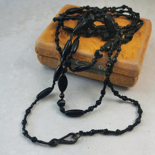 Victorian Black Glass Mourning Beads - Long Guard Chain Mourning Necklace