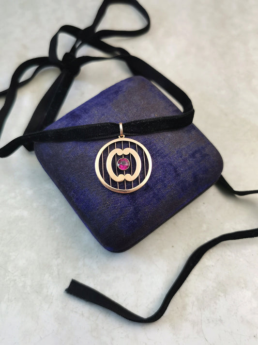 Edwardian 9ct Yellow Gold Pink Garnet Pendant on Black Velvet Choker