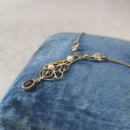 Edwardian 14k Yellow Gold Amethyst and Pearl Lavalier