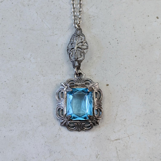 Art Deco Sterling Silver Blue Uranium Glass Set - Ring and Lavalier Necklace
