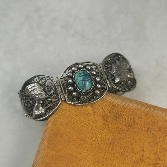 Vintage Egyptian Silver and Faience Scarab Beetle Filigree Bracelet