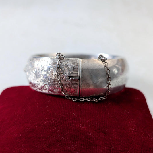 Vintage Sterling Silver Chased Cuff Bracelet with Marquise Cut Lab Ruby