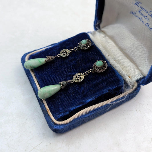 Vintage Chinese Export Jade Tear Drop Earrings - 14k Post Pierced Earrings - Gild Silver Filigree Dangle Stud Earrings