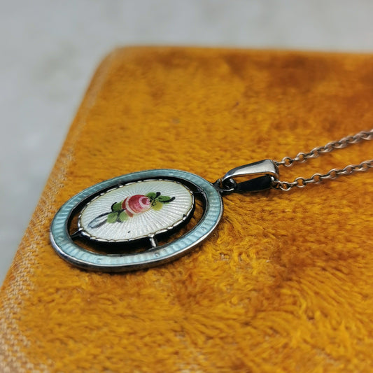 Vintage Sterling Silver Charles Horner Guilloché Enamel Rose Necklace
