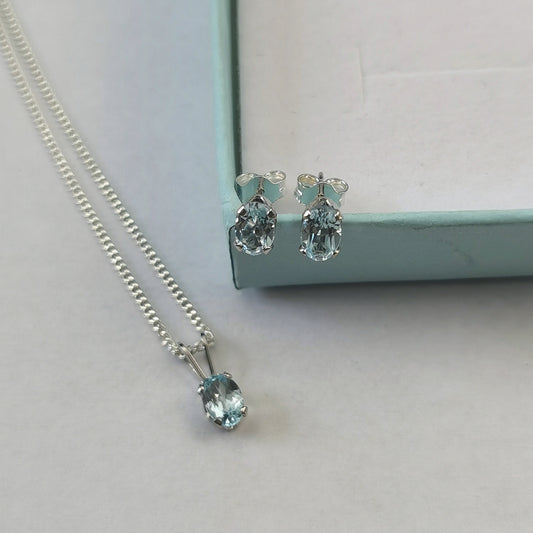 New Sterling Silver Blue Topaz December Birthstone Set - Studs and Necklace