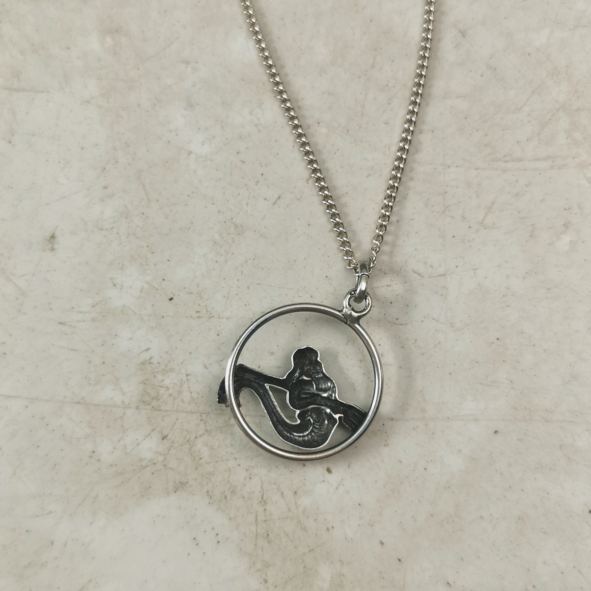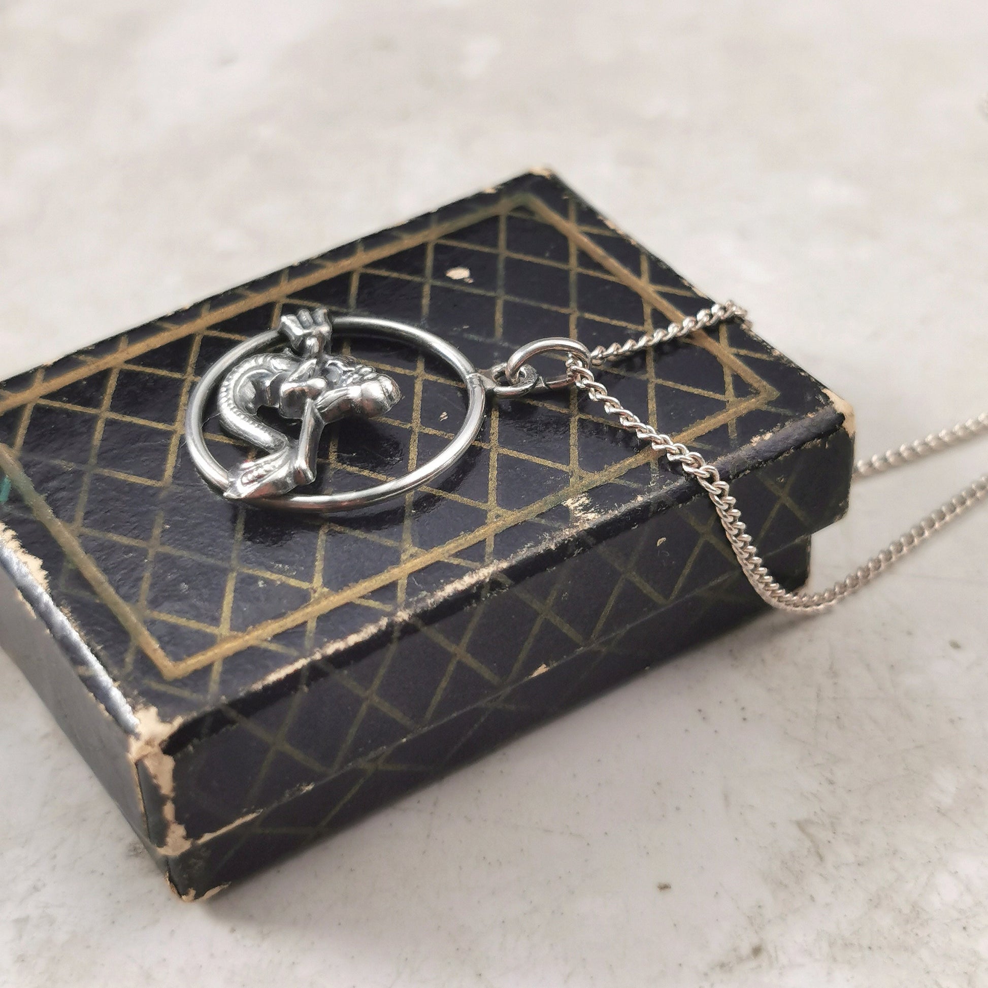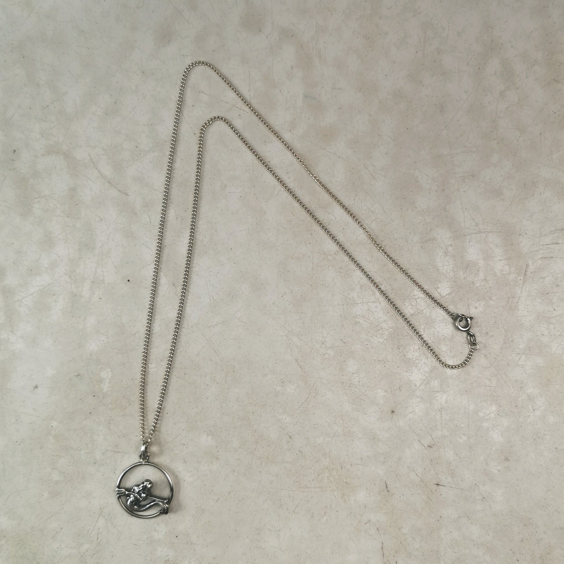 Vintage circa 1960s necklace constructed out of solid 835 purity silver. Pendant consists of a merman with a trident (hollow form) atop a silver ring, representing the Aquarius zodiac symbol for approx. January 20th to February 18th. Pendant measures 2.5cm long x 1.8cm wide. Original 1.3mm wide curb link chain is 19" long.