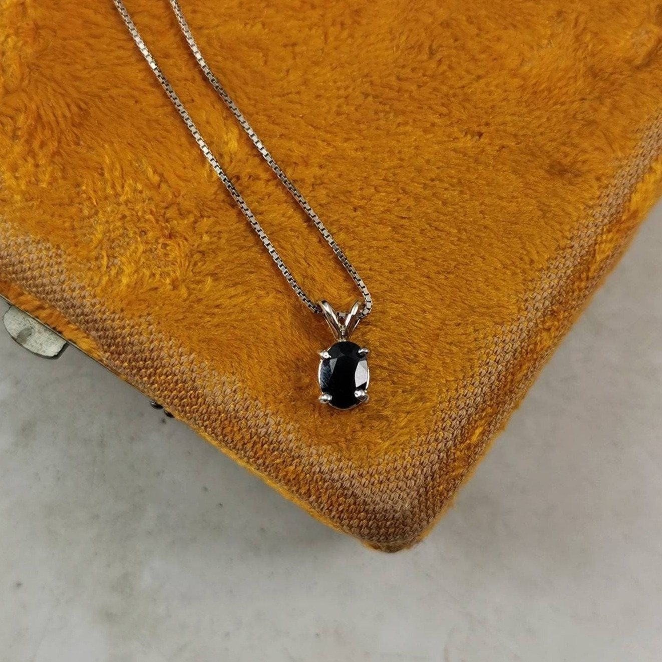 Estate pendant necklace constructed of solid 10k white gold and genuine sapphire. A mixed oval cut, very, very dark blue sapphire is set with 4 claws into pendant & measures 6.73mm long x 4.36mm wide. Pendant is strung on a 0.7mm wide box link chain.