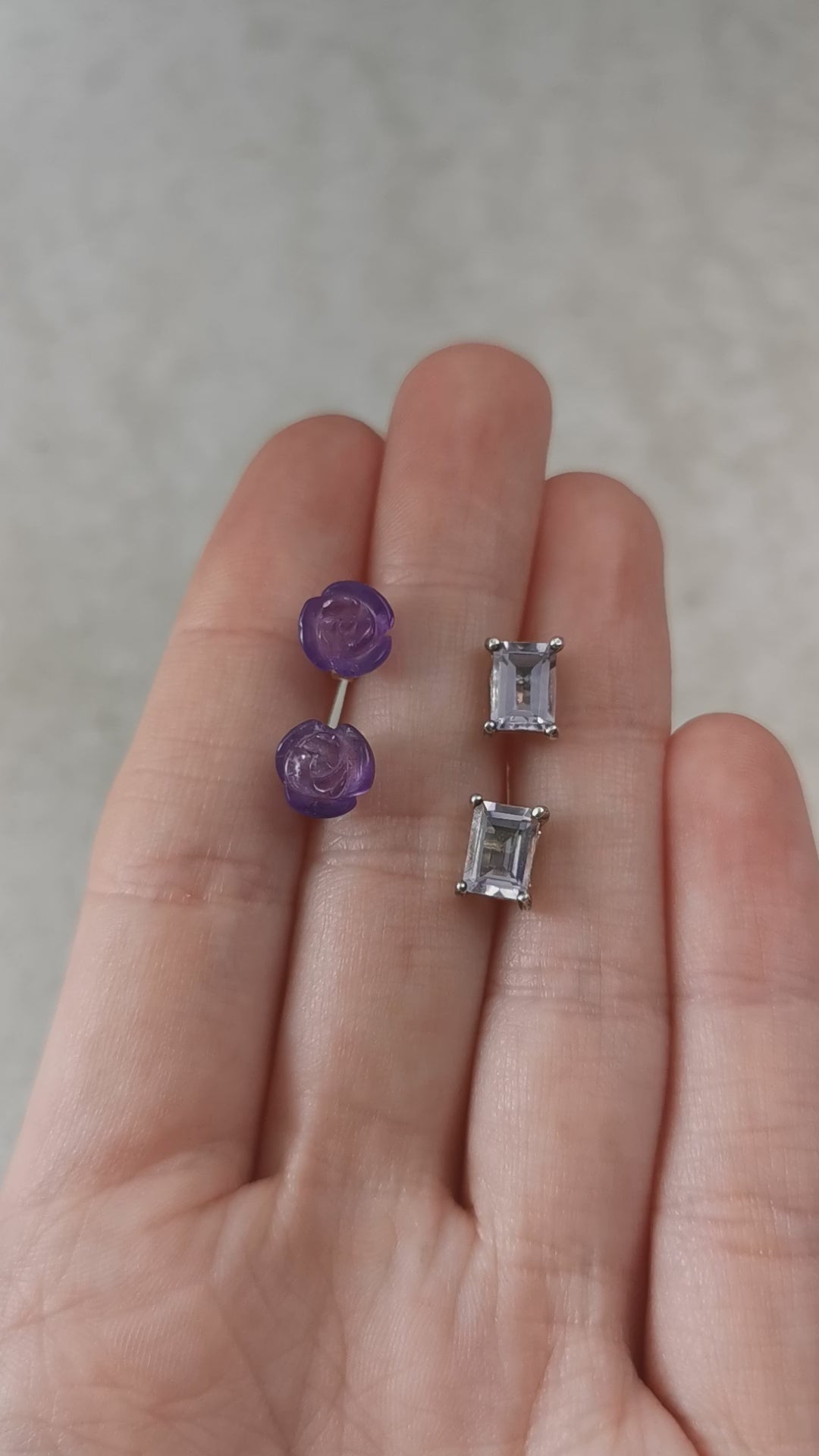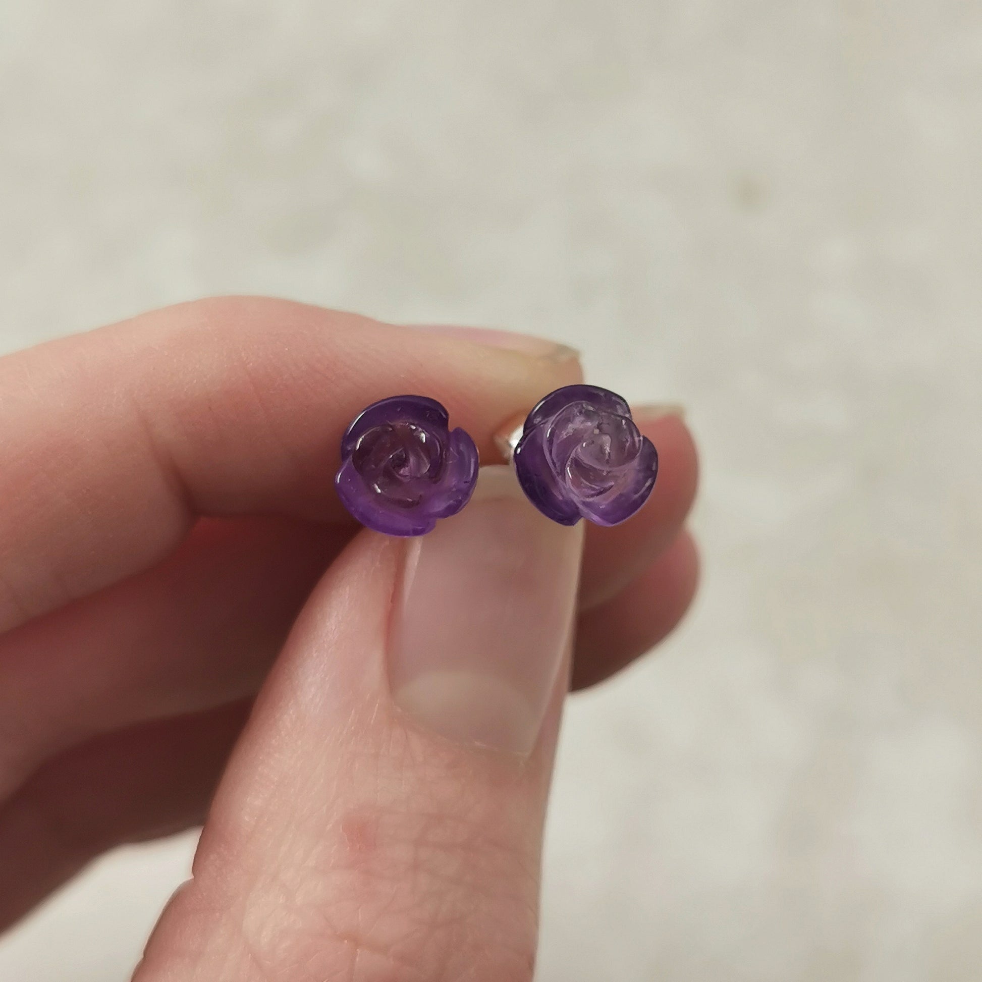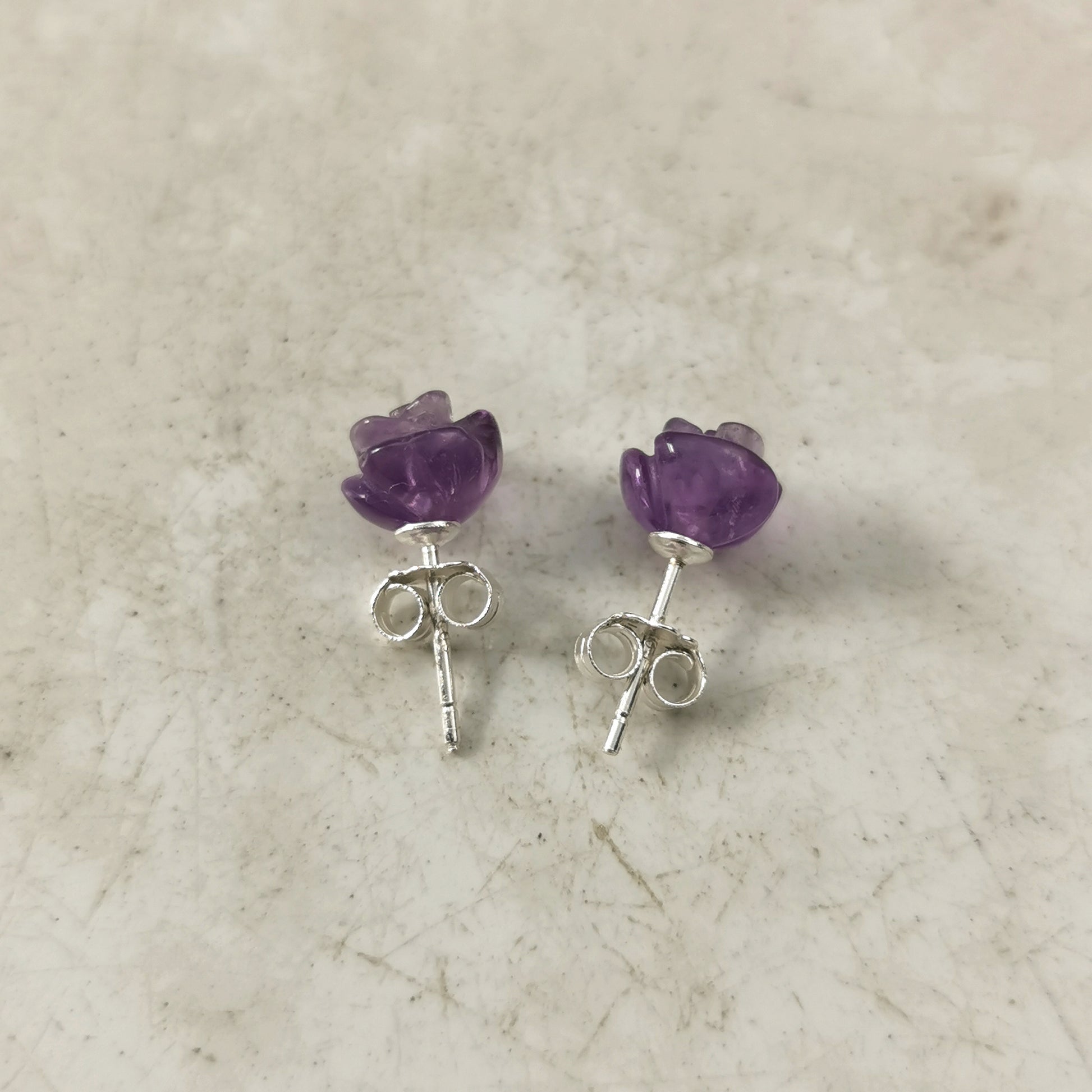 Estate stud earrings constructed of solid sterling silver and genuine amethyst. These cute studs feature hand carved into little roses/flowers.