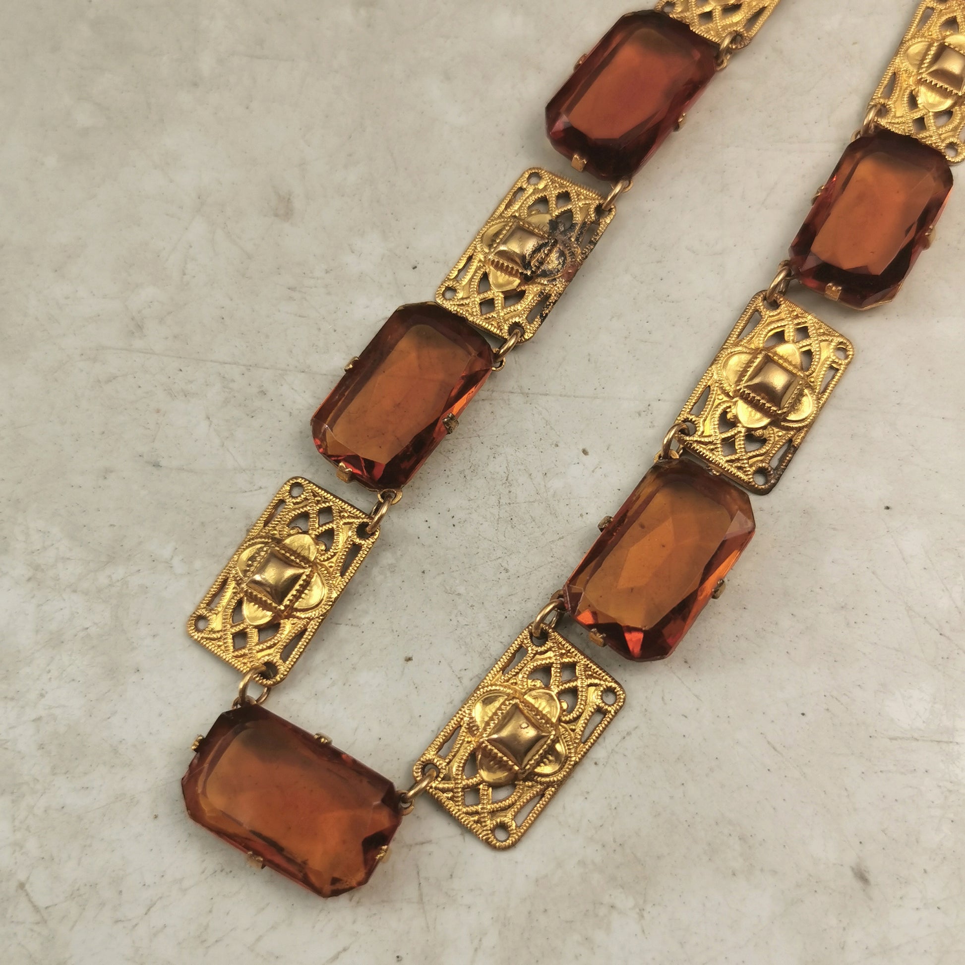 Antique turn of the century necklace constructed out of base metal and glass. This beautiful rivière style necklace is made with alternating links of die cast filigree panels and orange glass lozenge links. Some of the filigree panels have plating missing, as does some of the extender chain consistent with ageEach lozenge link measures 2cm wide x 1.3cm long. Each filigree link measured 2cm wide x 1.2cm long.