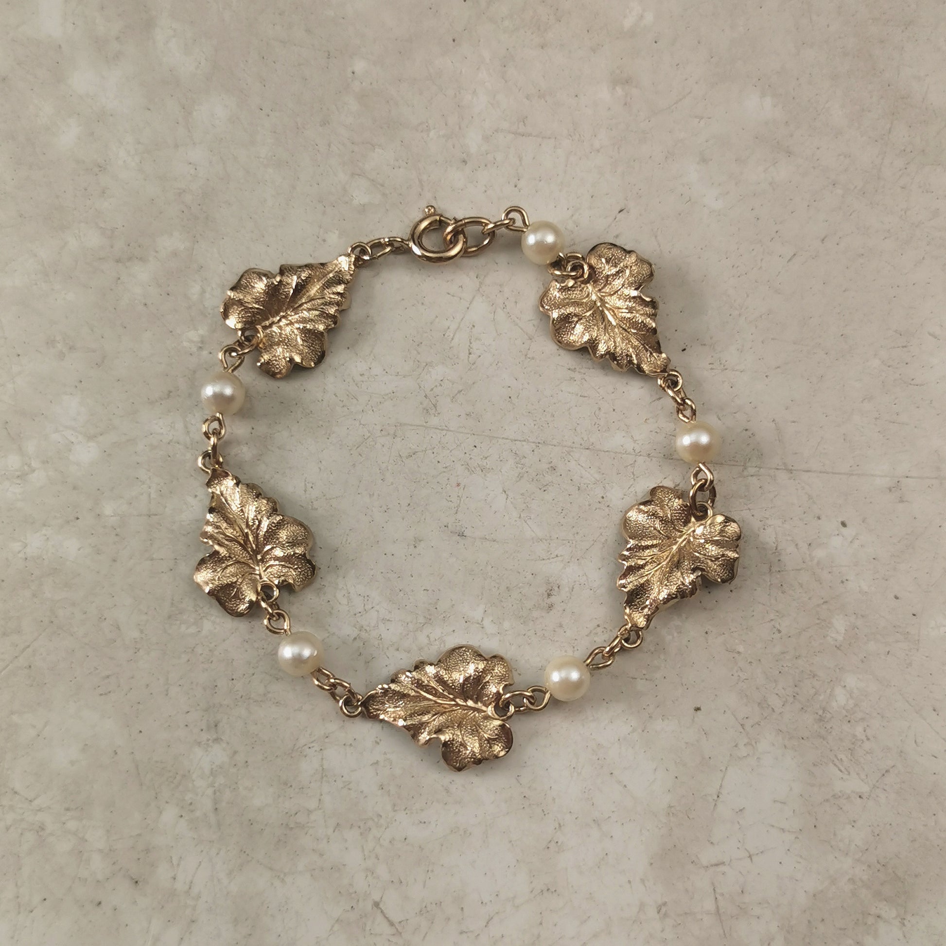 Vintage bracelet circa 1950s constructed out of base metal, gold fill and genuine cultured pearls. Bracelet is composed of five ivy leaves interspersed with five approx. 5mm pearls.