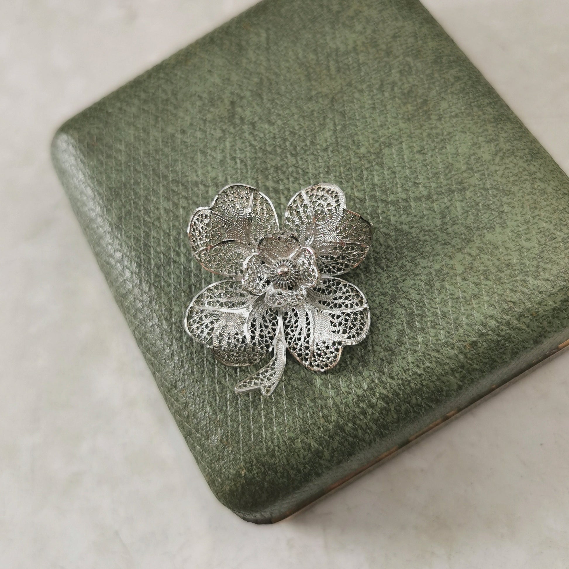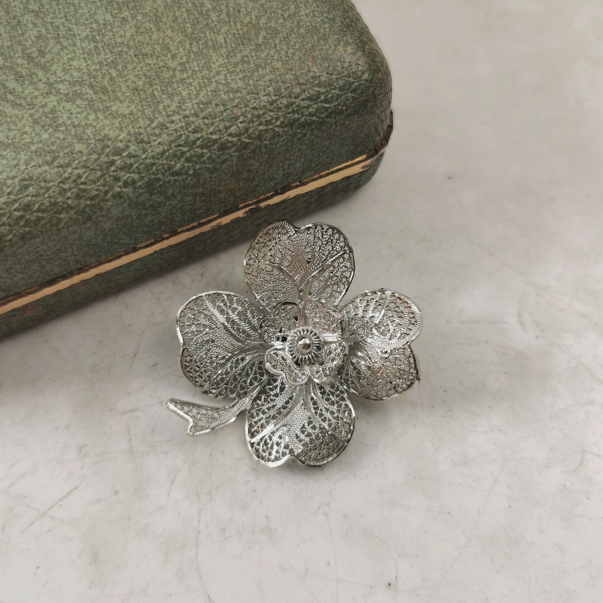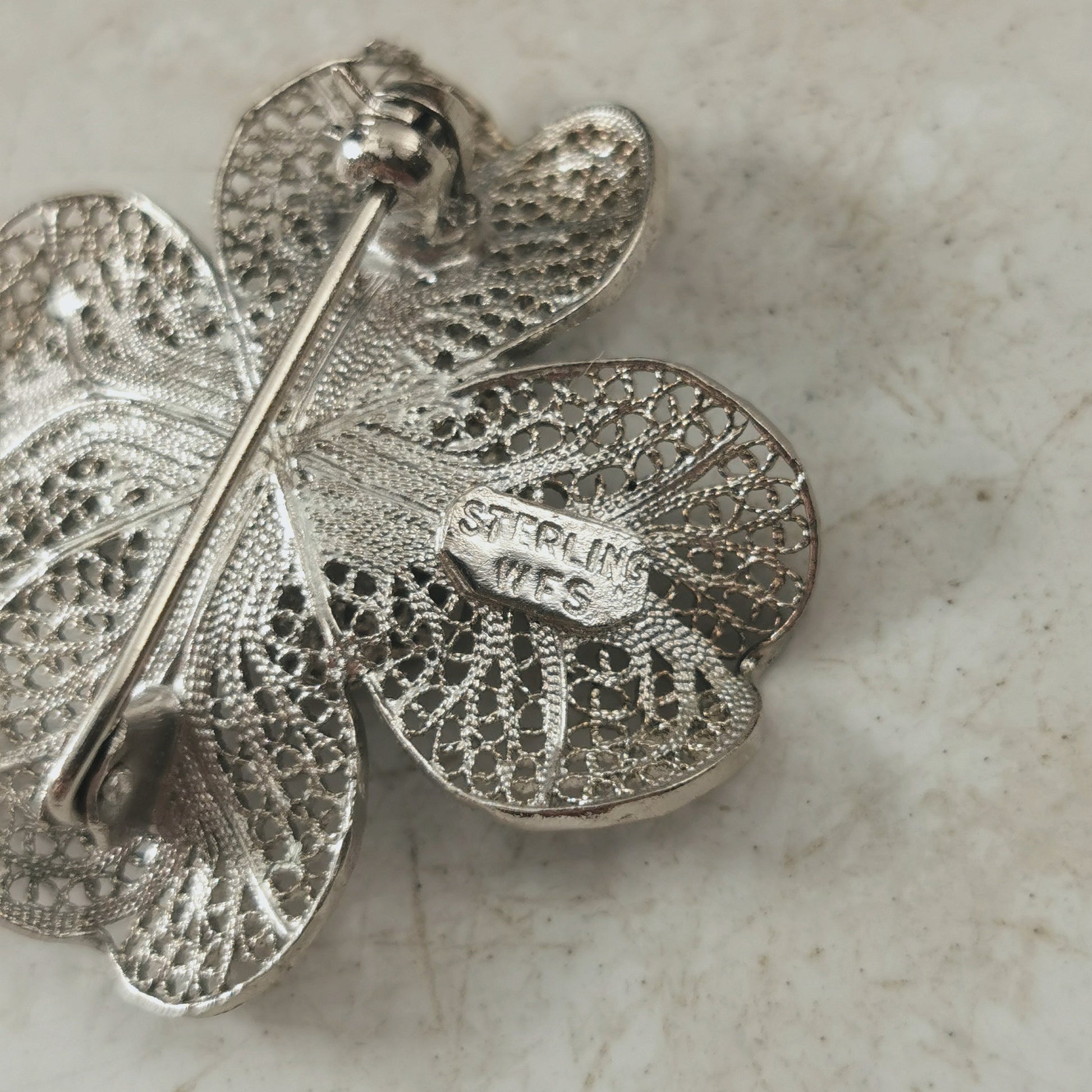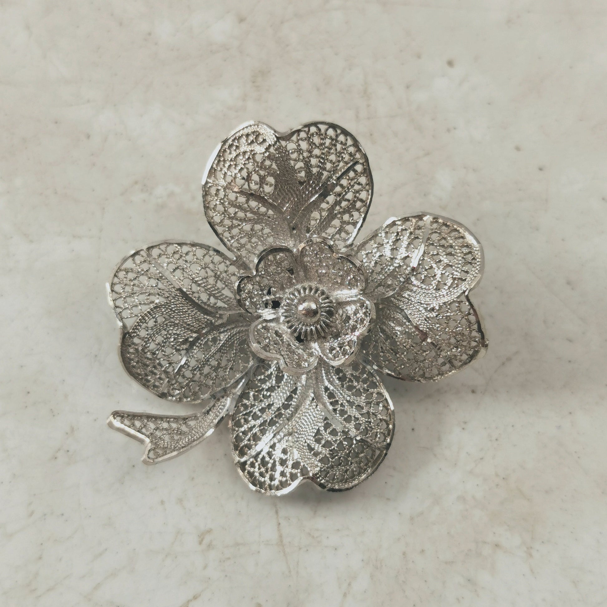 Vintage Sterling Silver Filigree Four Leaf Clover Brooch