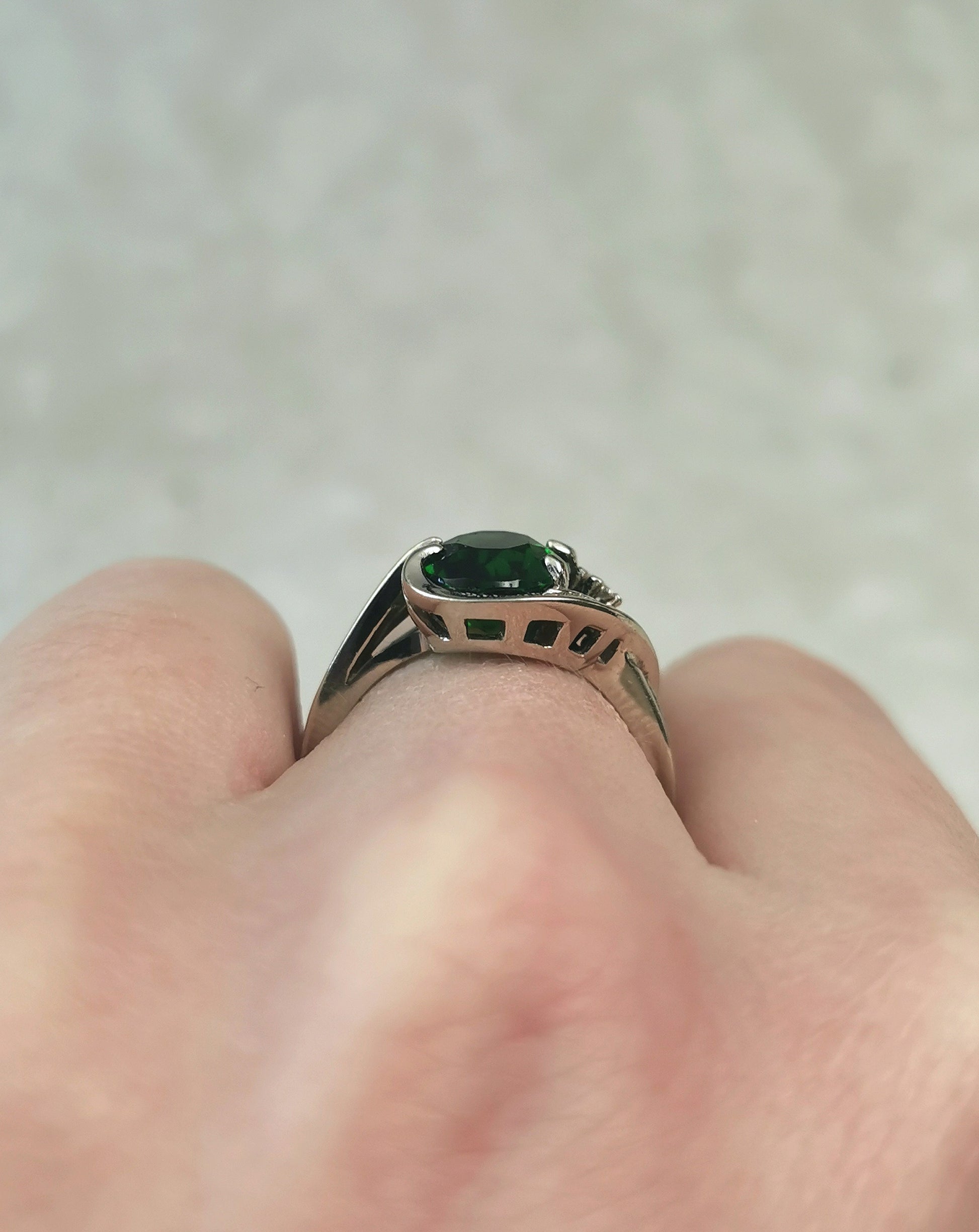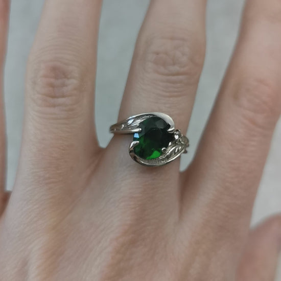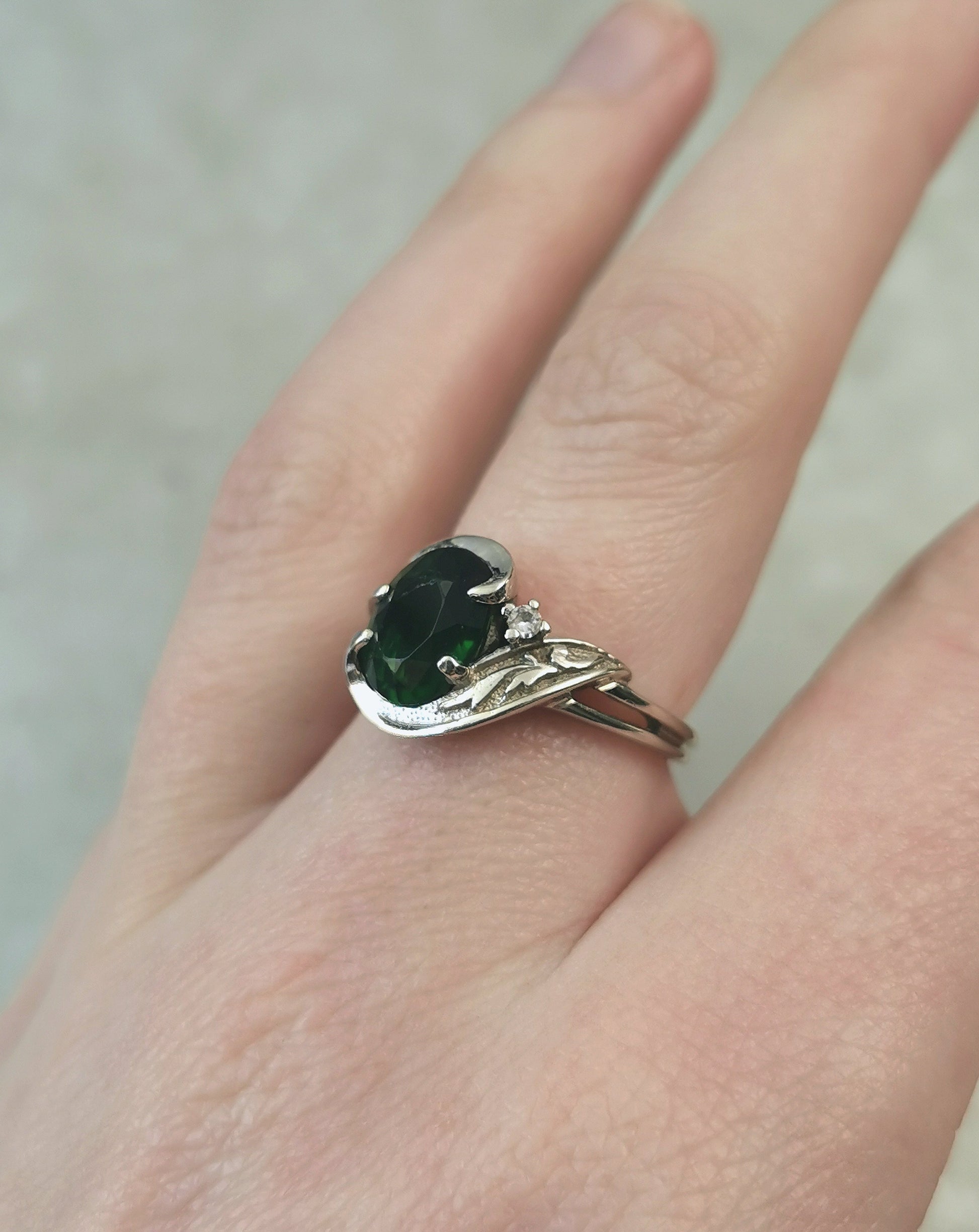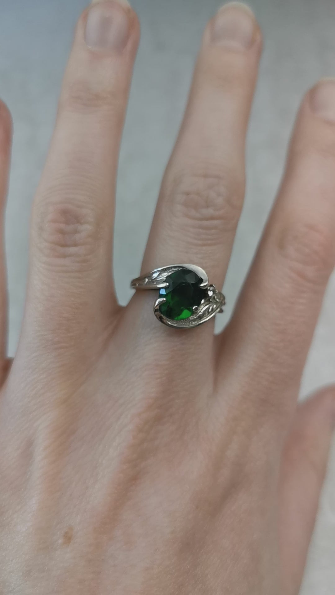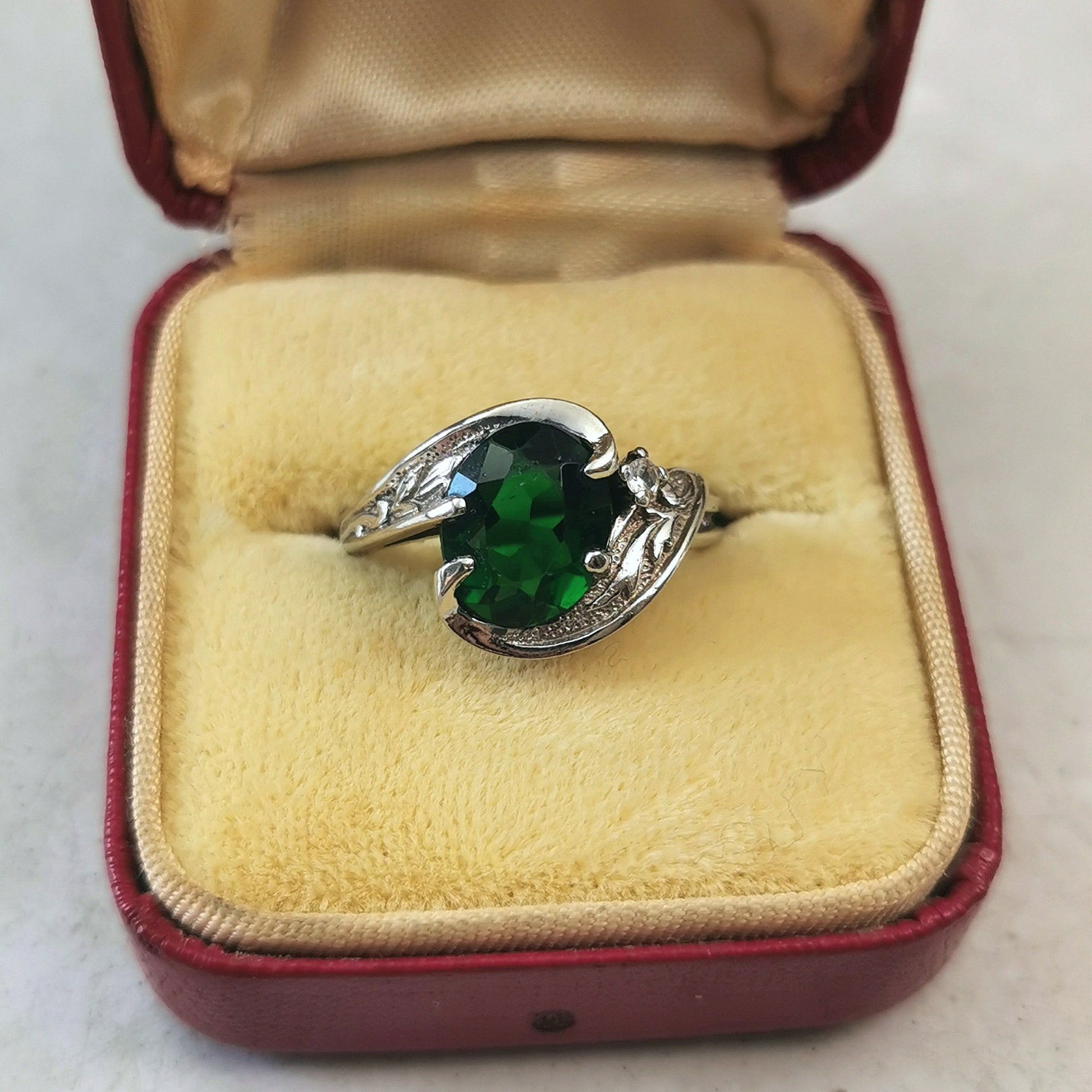 Estate ring constructed out of solid 10k white gold with glass stones. A 9.8mm x 8.05mm oval mixed cut, imitation emerald is set diagonally across ring. A small 1.8mm colourless glass gem is set to one side of the faux emerald. Shoulders are textured with leaf patterns. Face of ring is 1.2cm long.