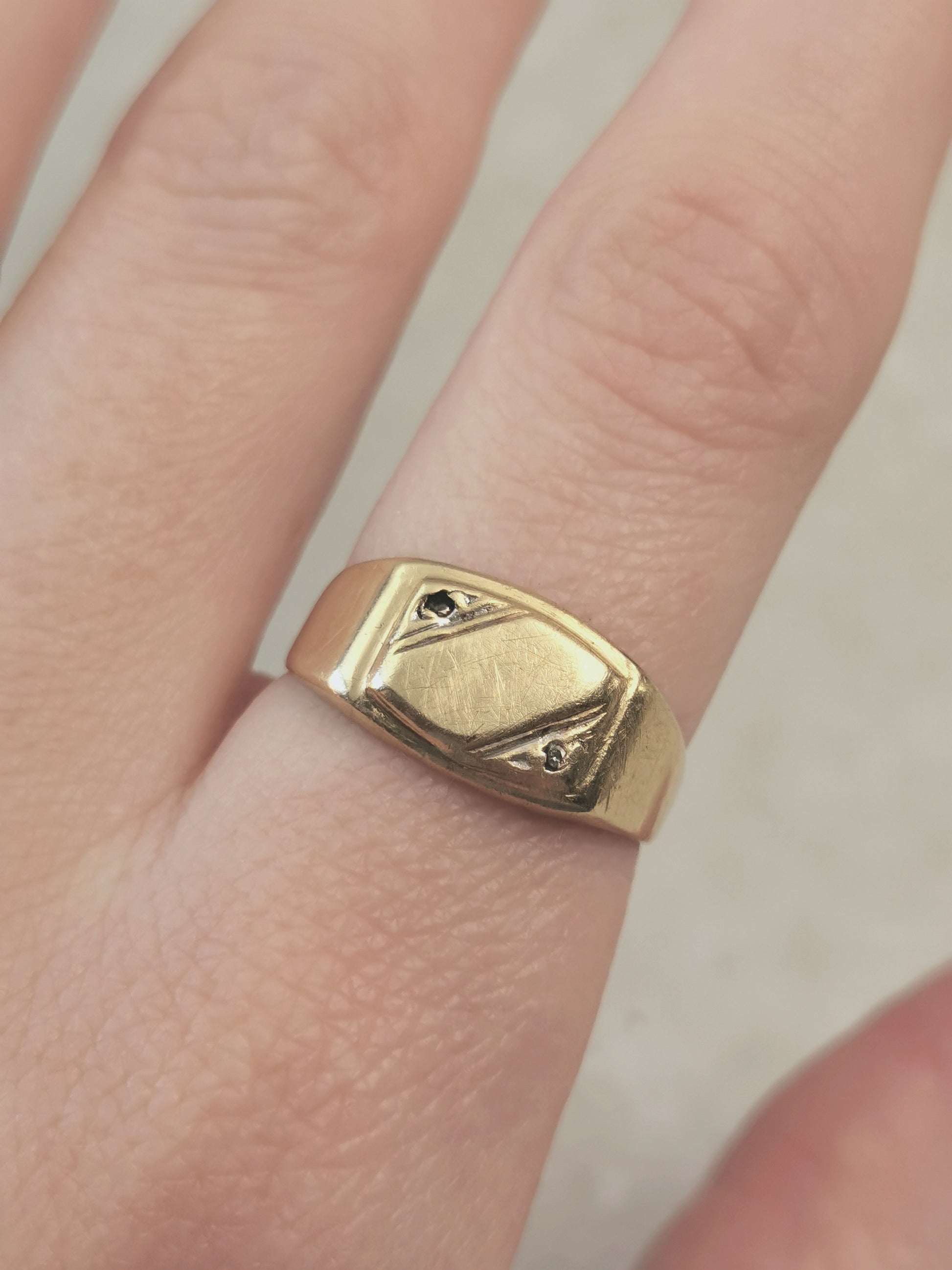 Vintage signet ring constructed out of solid 10k yellow gold and diamonds. Two small 1mm diamonds are set into opposing corners. Blank signet face can be engraved with an initial by a jeweller or left as is. Ring has not been polished so there are scuffs.