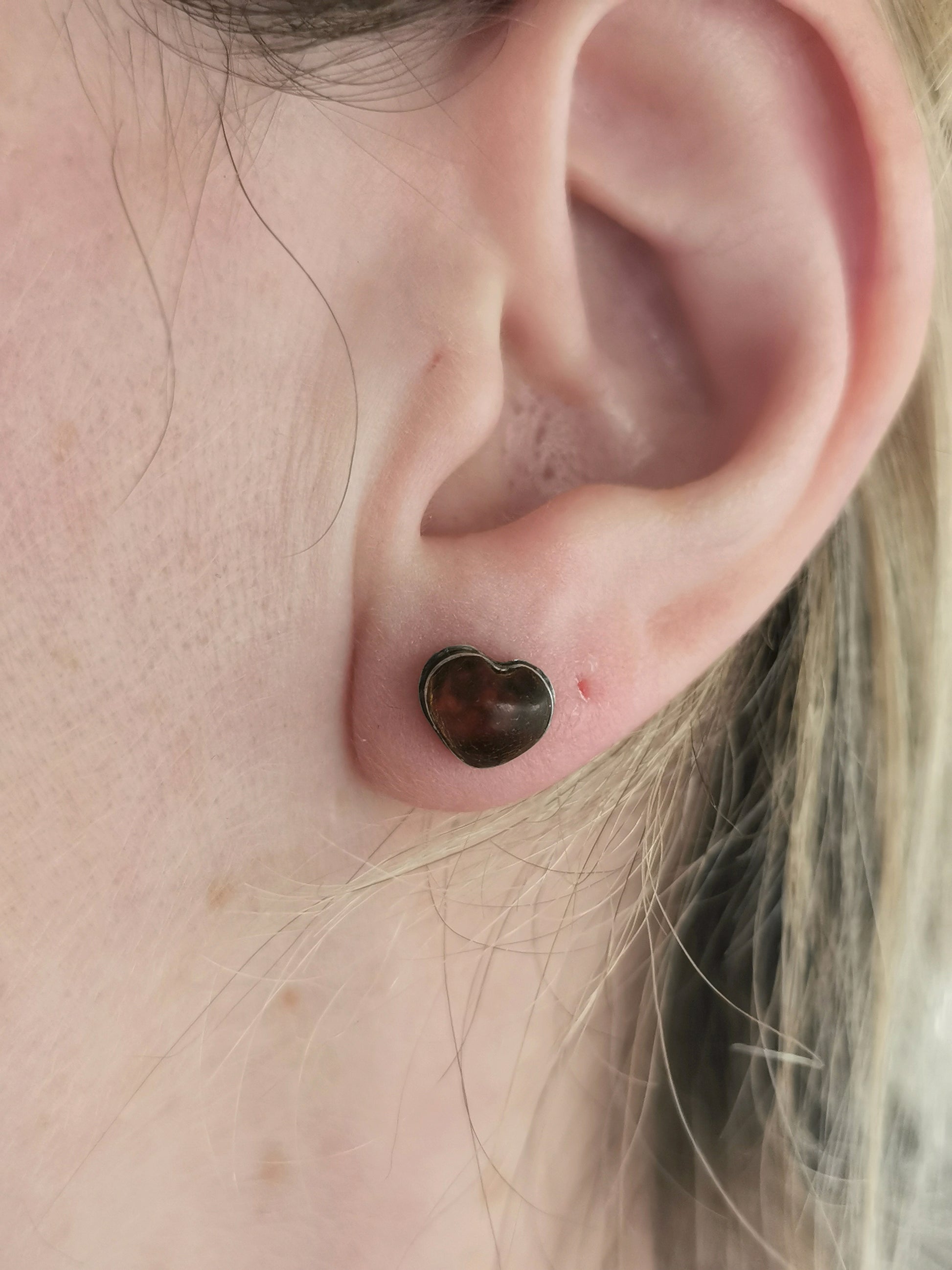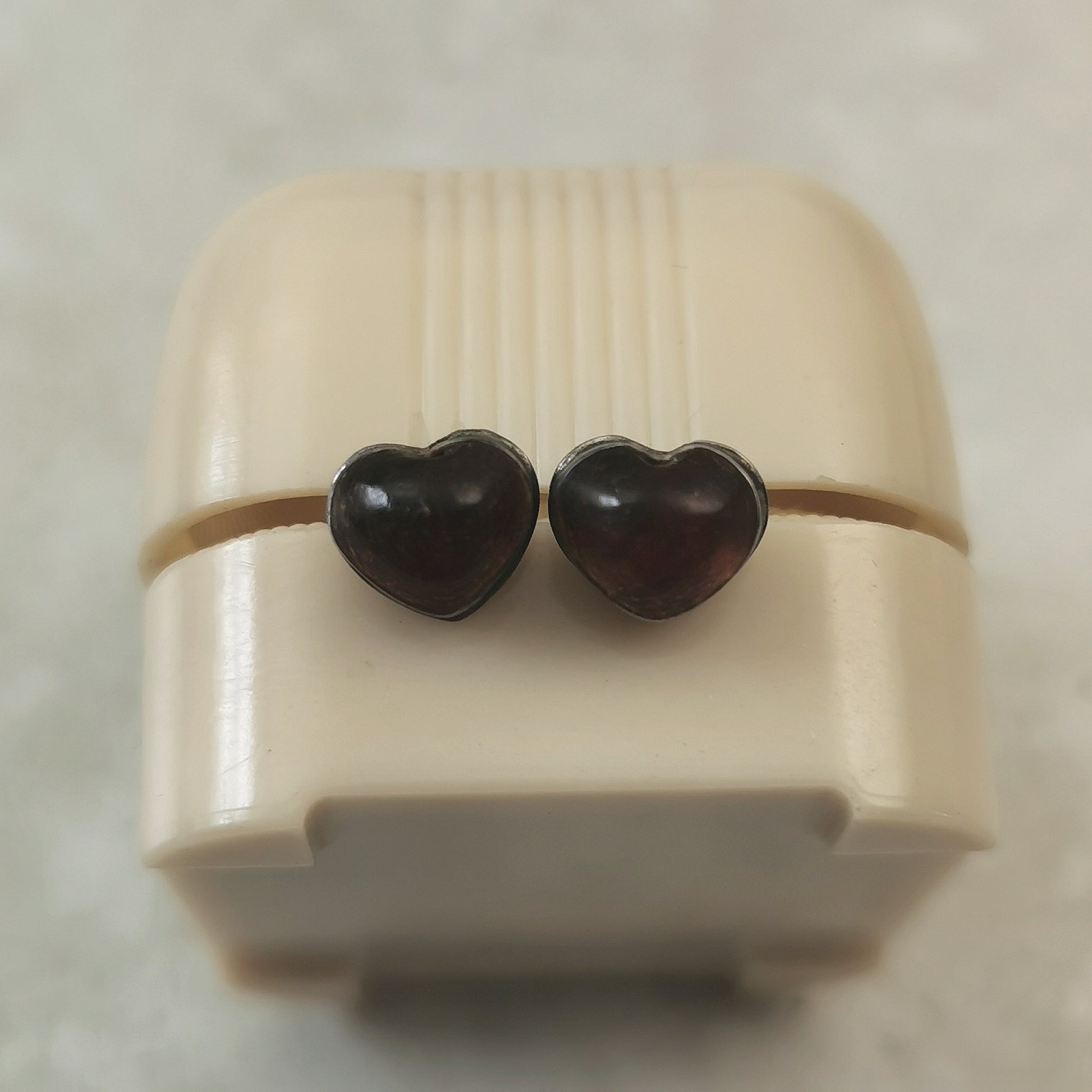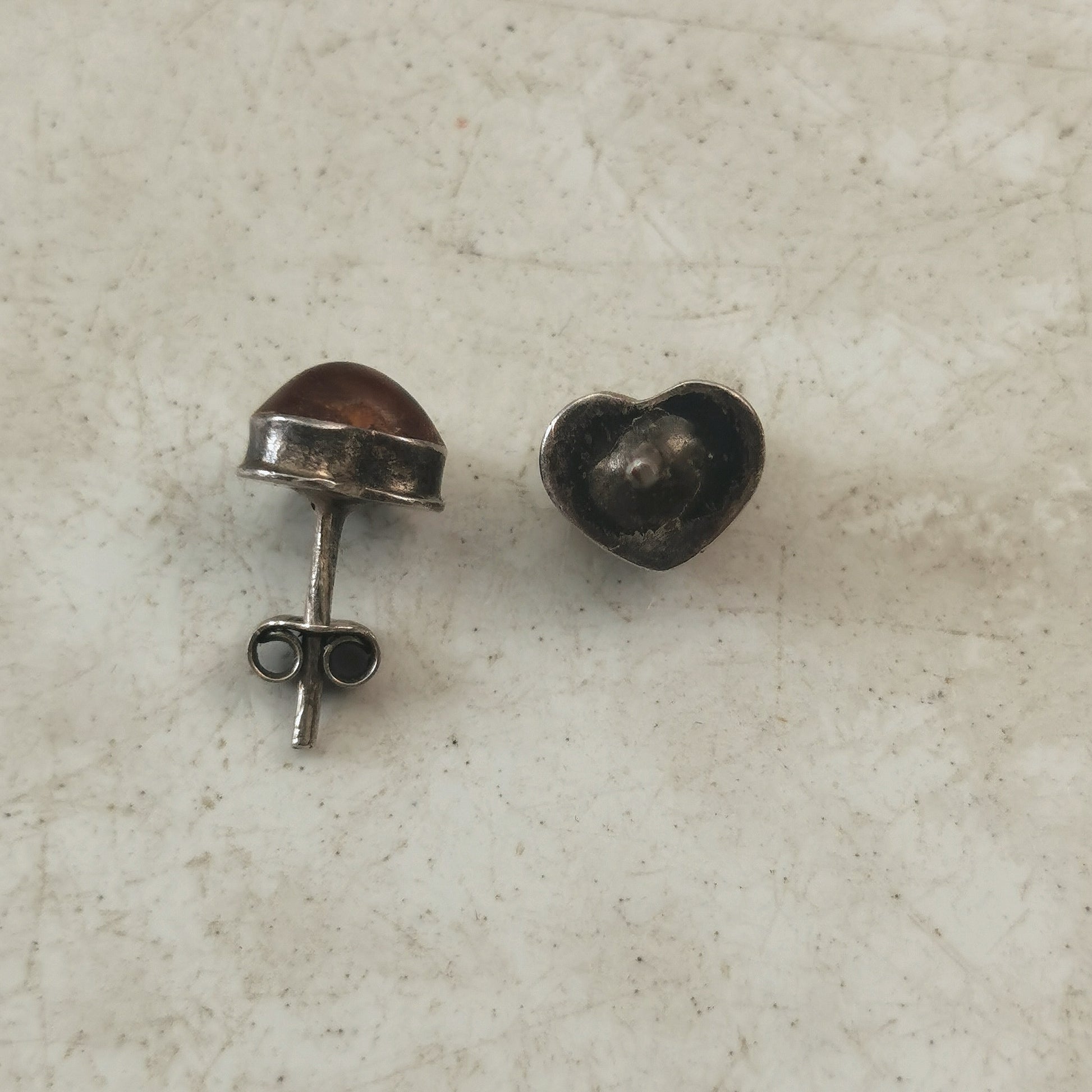 Vintage earrings constructed out of solid sterling silver and genuine amber. These sweet heart shaped earrings have an approx. 7mm x 8mm amber cabochon bezel set into each stud. Earrings measure 8mm long x 8.5mm wide.