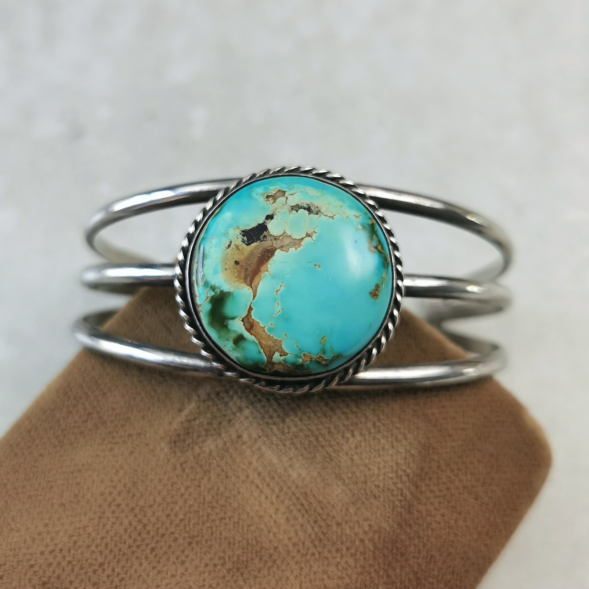 Vintage cuff bracelet constructed out of solid sterling silver and turquoise. A 2.5cm diameter round genuine turquoise cabochon is bezel set with a twisted wire border. Turquoise is a beautiful robins egg blue hue, with veins of brown matrix in it. The adjustable cuff style bracelet is made of three fanned out 3mm wide bands.