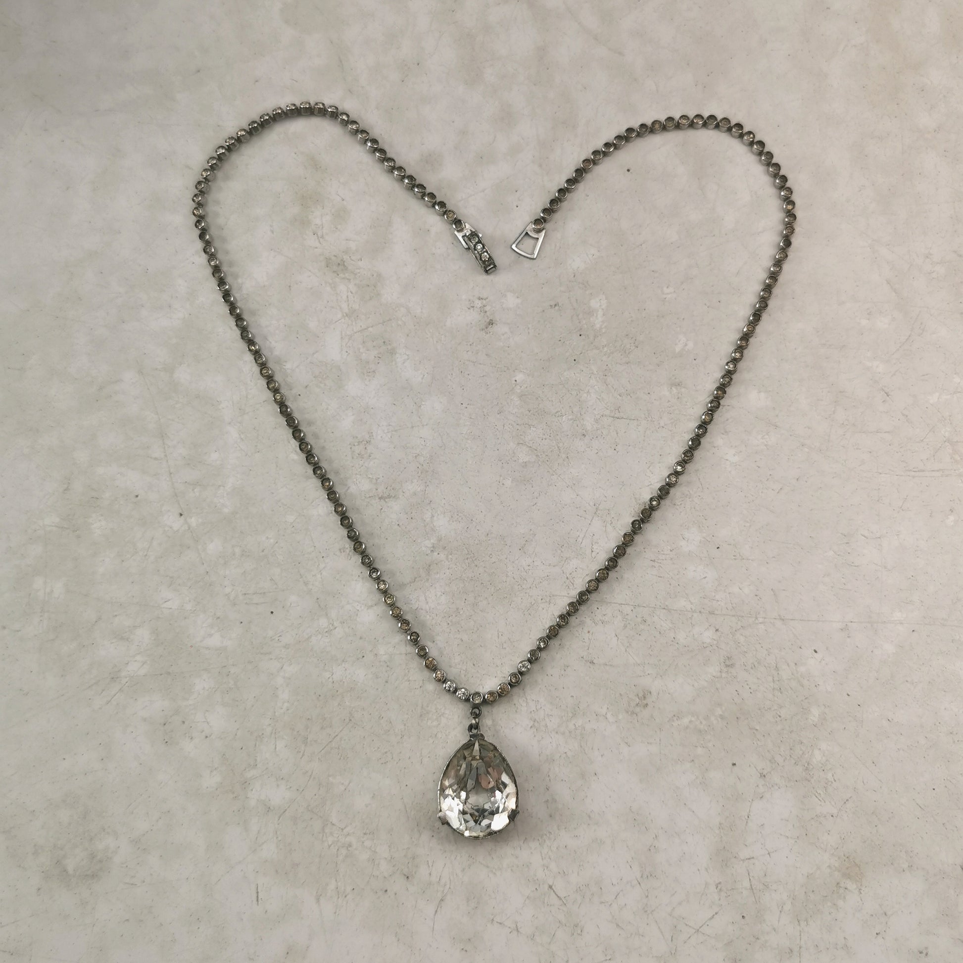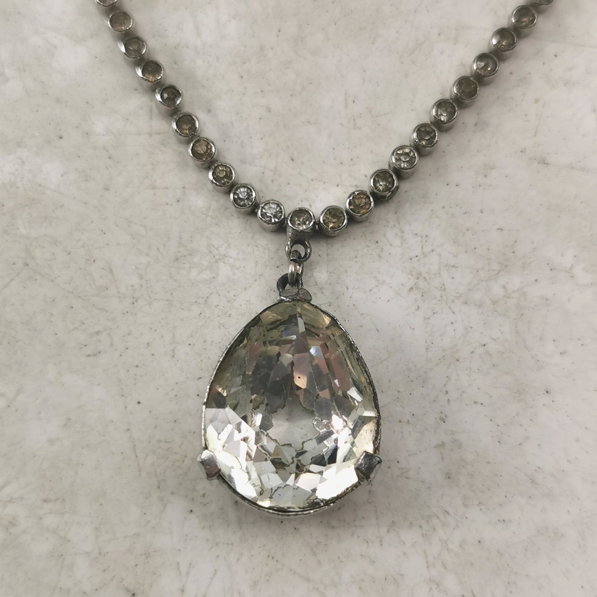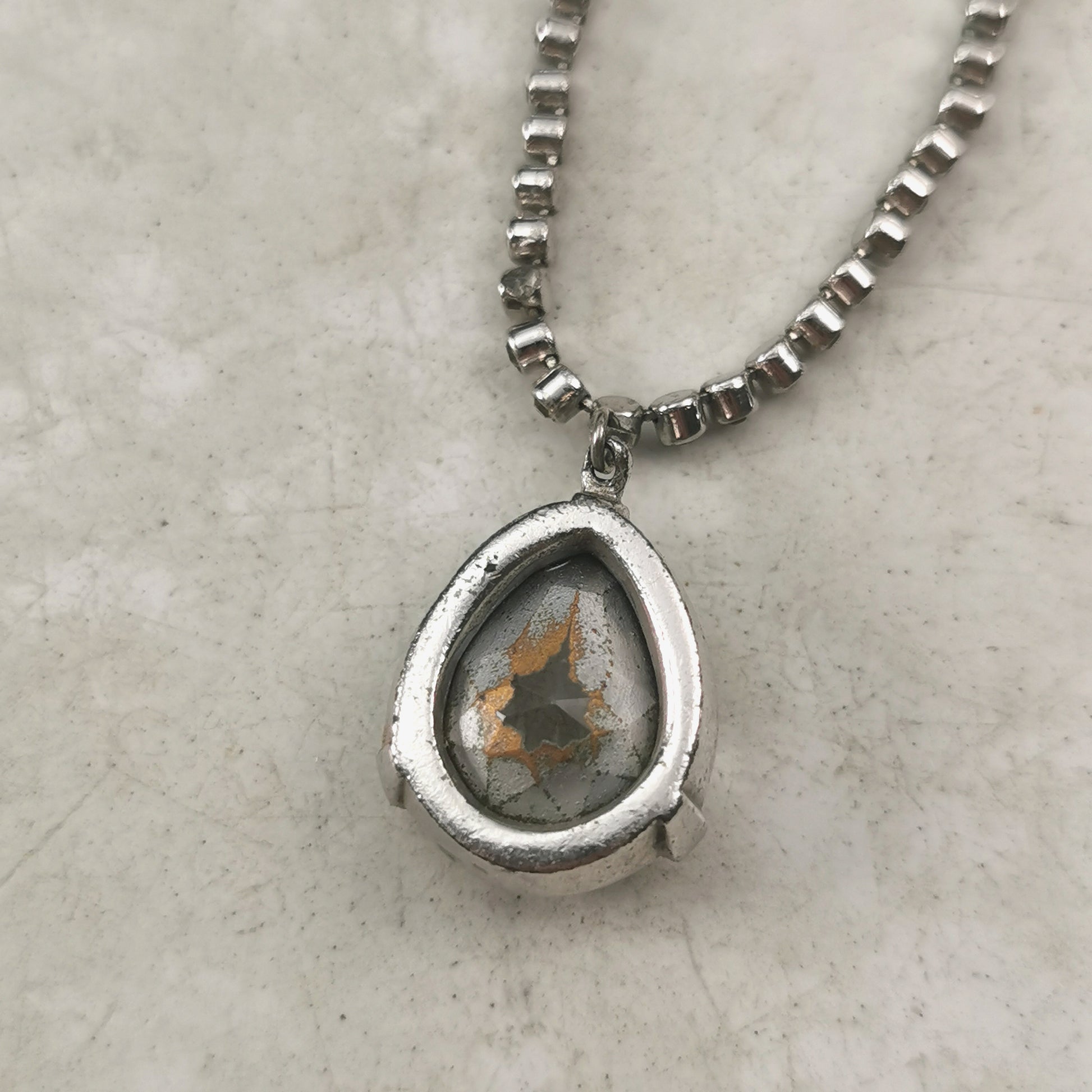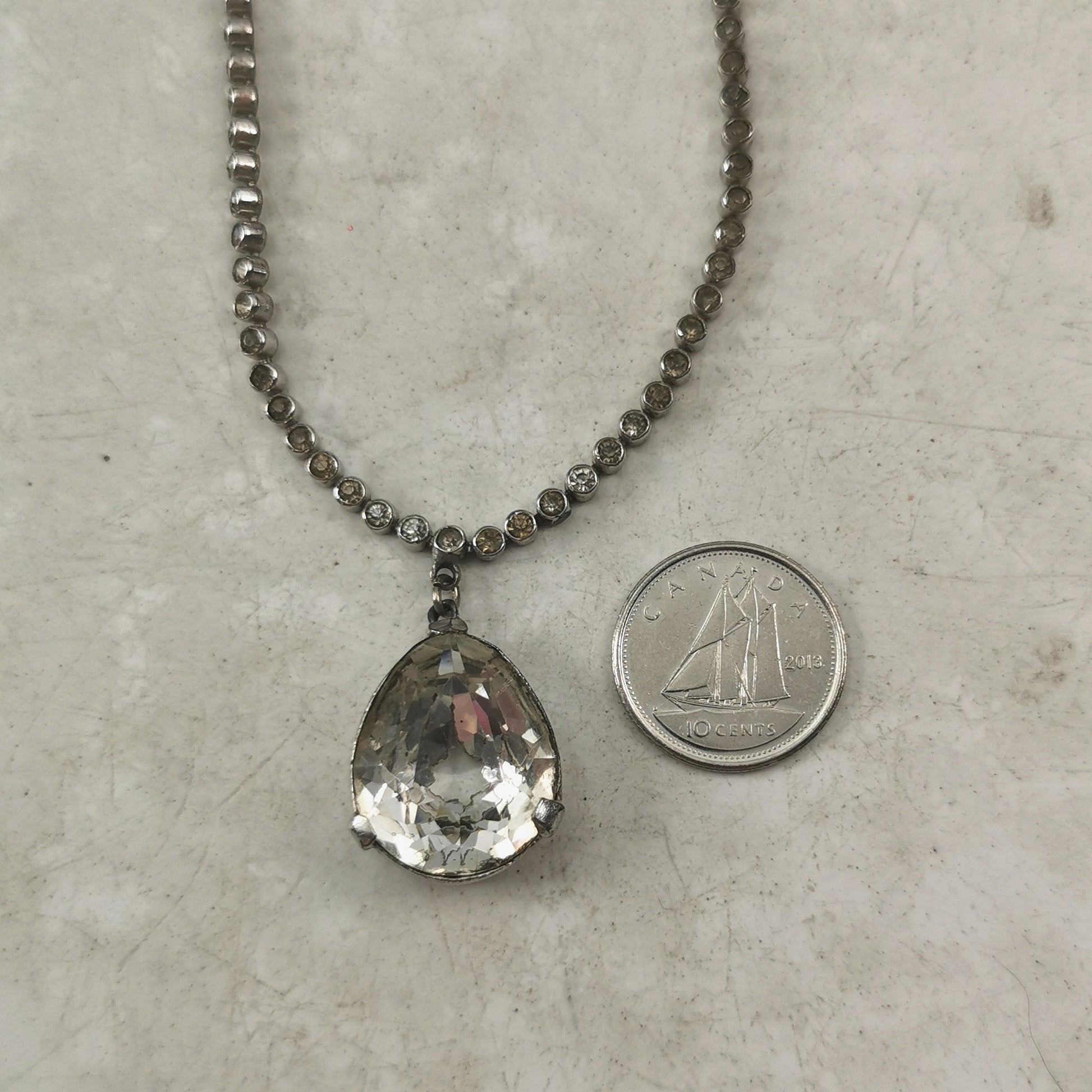 Vintage circa 1940s necklace constructed out of pot metal and rhinestones. Necklace features an 18.2mm long x 15.7mm chubby pear crystal rhinestone drop pendant on a strand of 1.9mm bezel set, closed back rhinestones. The chubby pear rhinestone has heavy wear on the back of it, and all of the rhinestones in the strand are black to brown to yellow to clear. Fold-over clasp has 3 rhinestones set into it and it is in good secure working order.