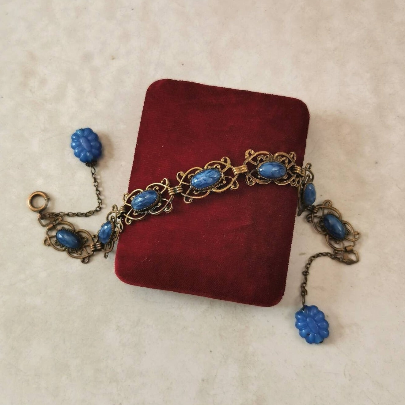 Antique 1910s bracelet constructed of brass and glass. This amazing Czech glass bracelet features 7 blue glass oval cabochons that are set into a filigree links. The blue glass has an iridescent sheen to it. Each link measures 2.2 cm long x 1.3 cm wide. At each end of the bracelet, a blue glass flower bead is suspended from a cable chain (one endf is missing a brass cap bead). The dangling flower parts measure 1.6cm long and look beautiful when worn. Bracelet has an old style spring ring in good working order and measures 7.75" long.