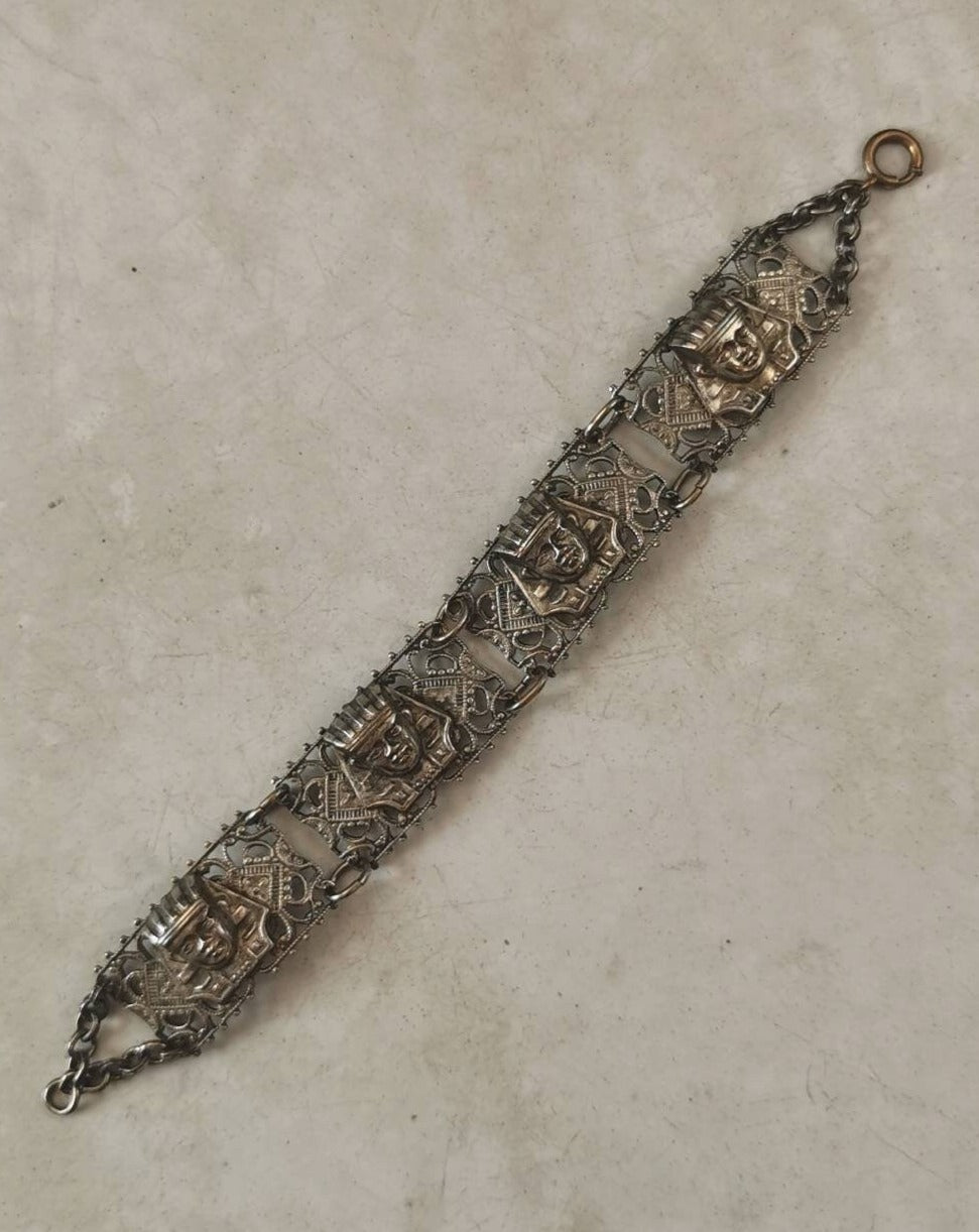 The bracelet consists of 4 rectangular filigree panels, each with King Tuts head on them measuring 3.4cm long x 2cm wide. The same rolo chain as necklace finishes out each end of the bracelet with an old style spring ring in good working order. Bracelet measures 7" long.