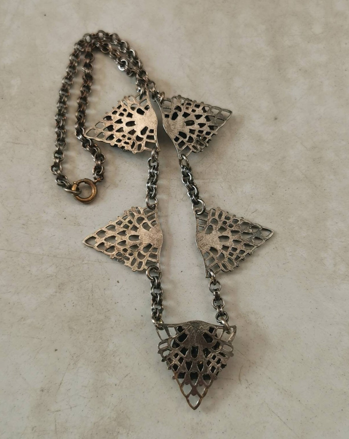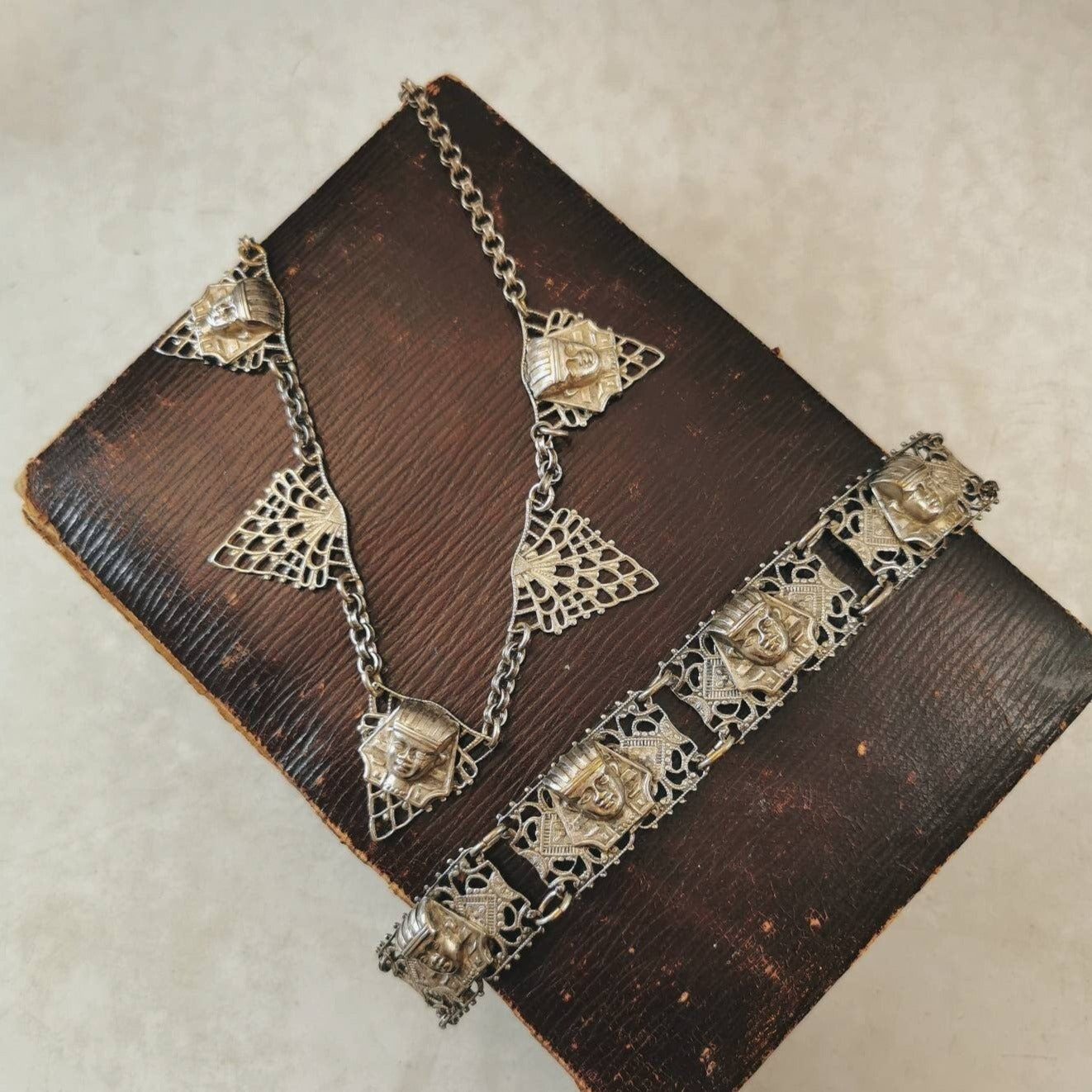 Egyptian revival circa 1920s necklace and bracelet set constructed of silver tone plate on brass.