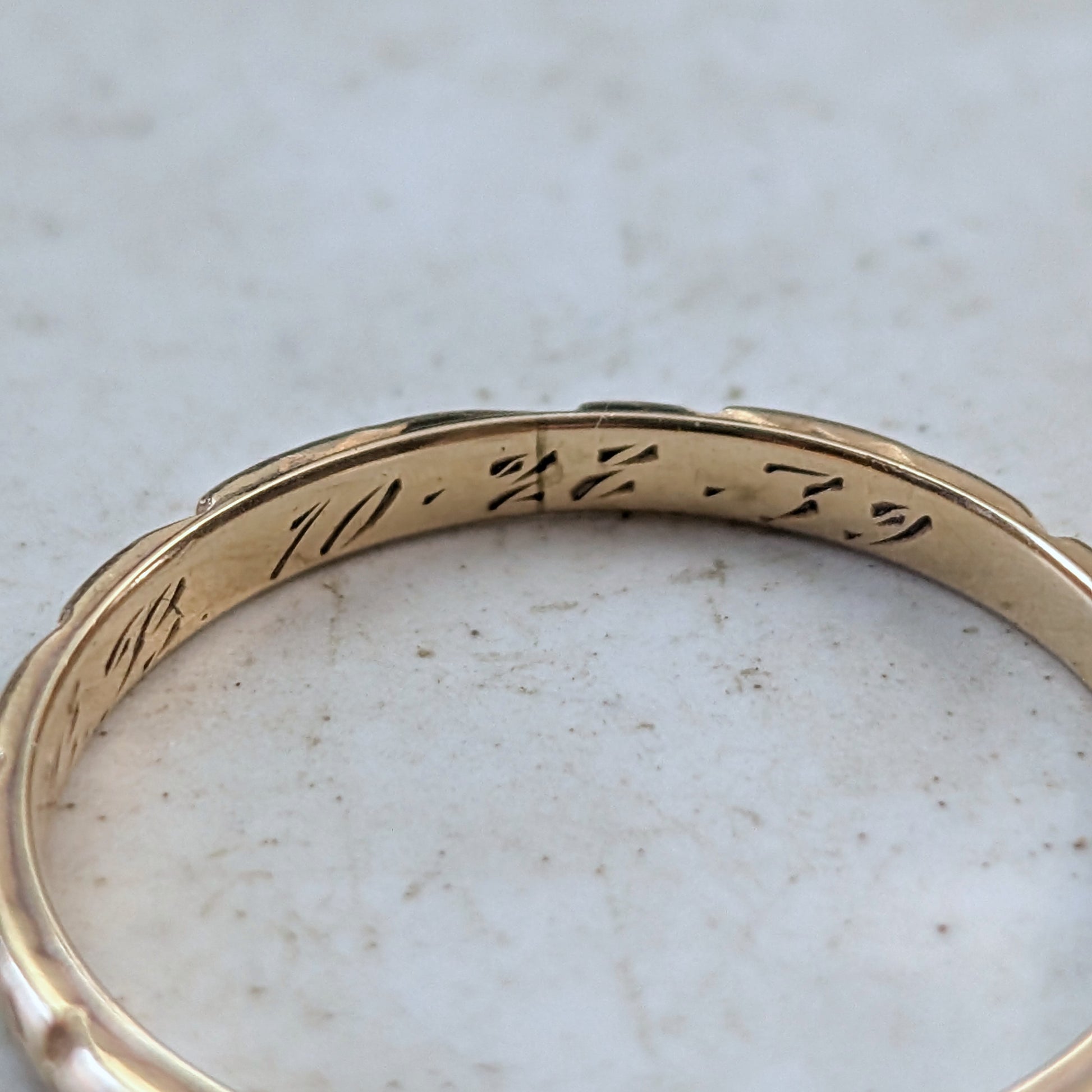 - hand engraved inside band is initials 'P.M. To. B.B.' with the date '10.22.39' in script