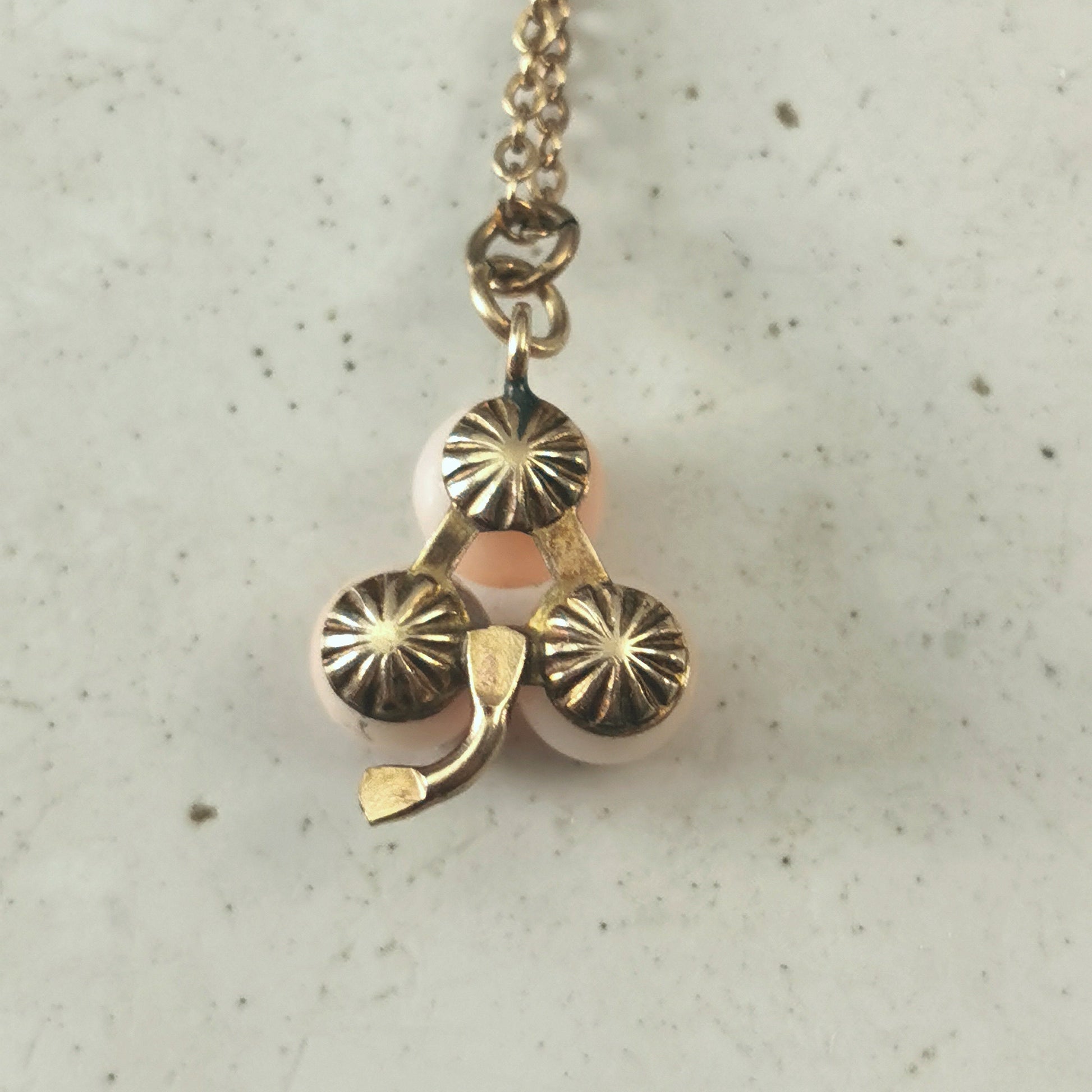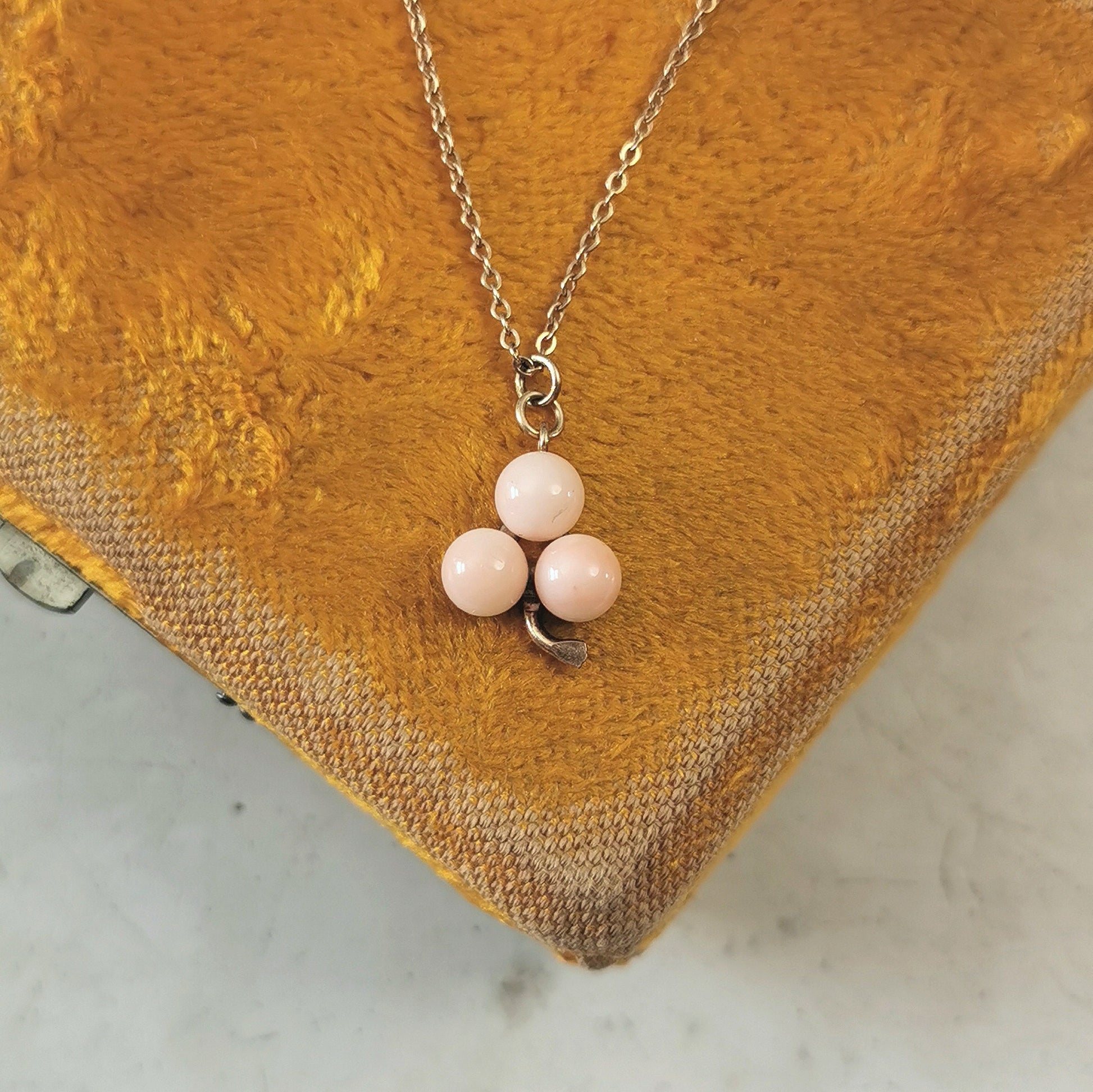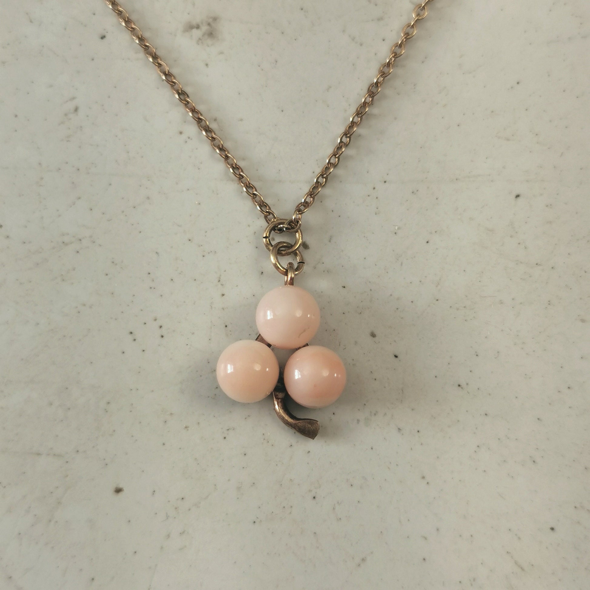 - stylized trefoil pendant features 3 mottled coral balls measuring roughly 5.5mm to 5.6mm each