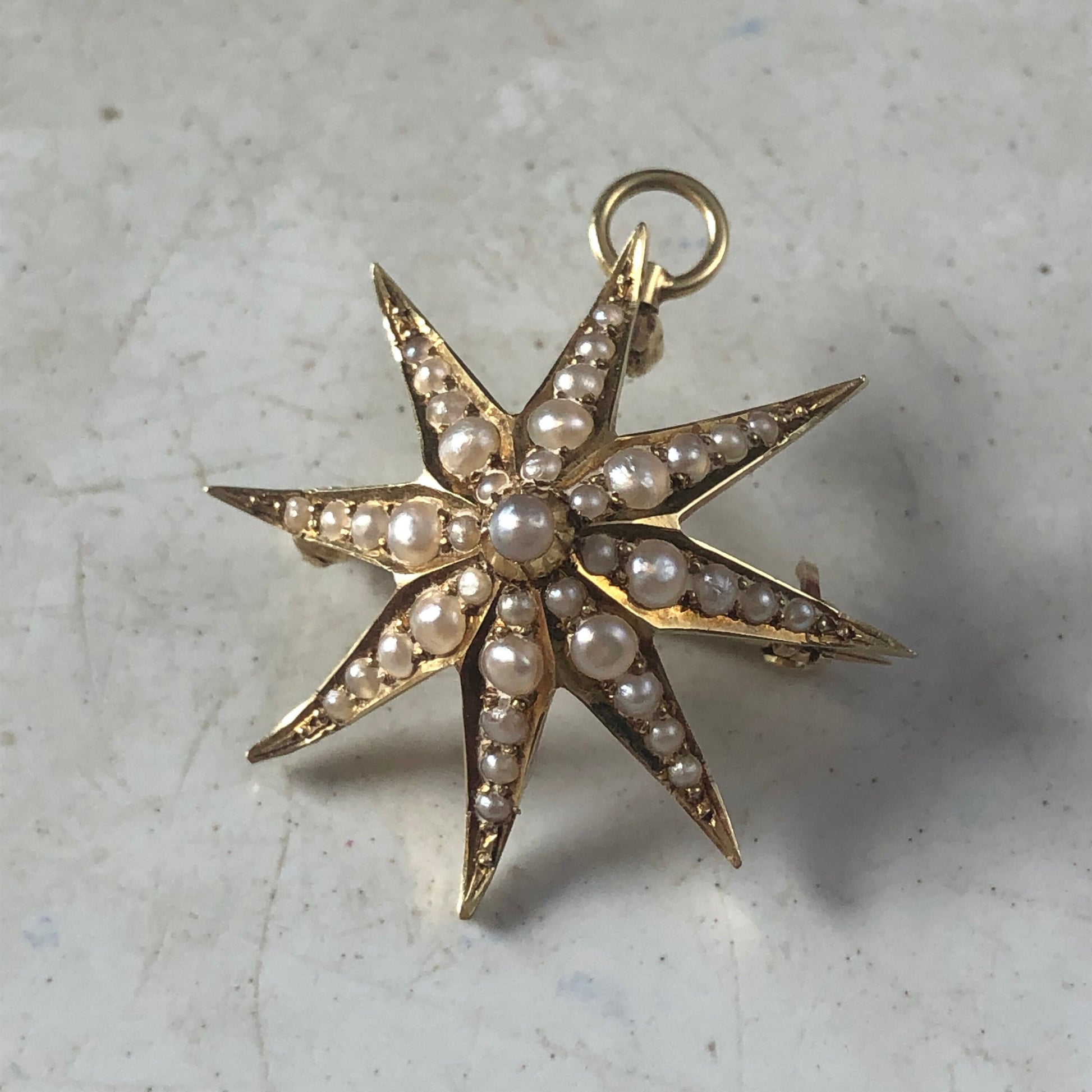 Edwardian 14k Gold Yellow Gold & Seed Pearl Starburst Convertible Pendant Brooch