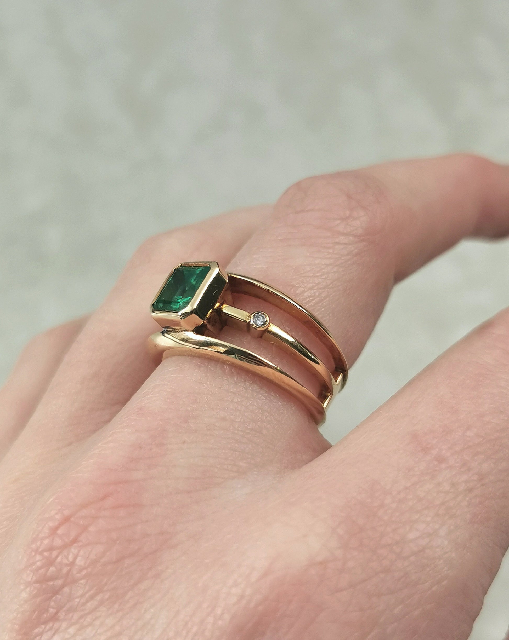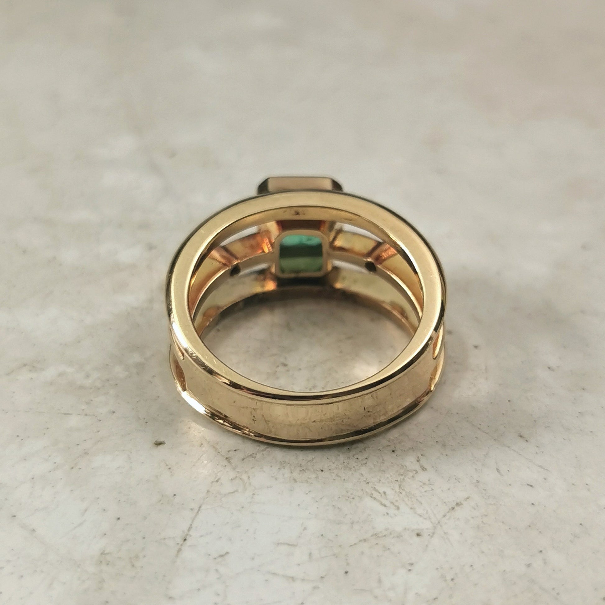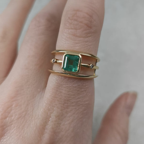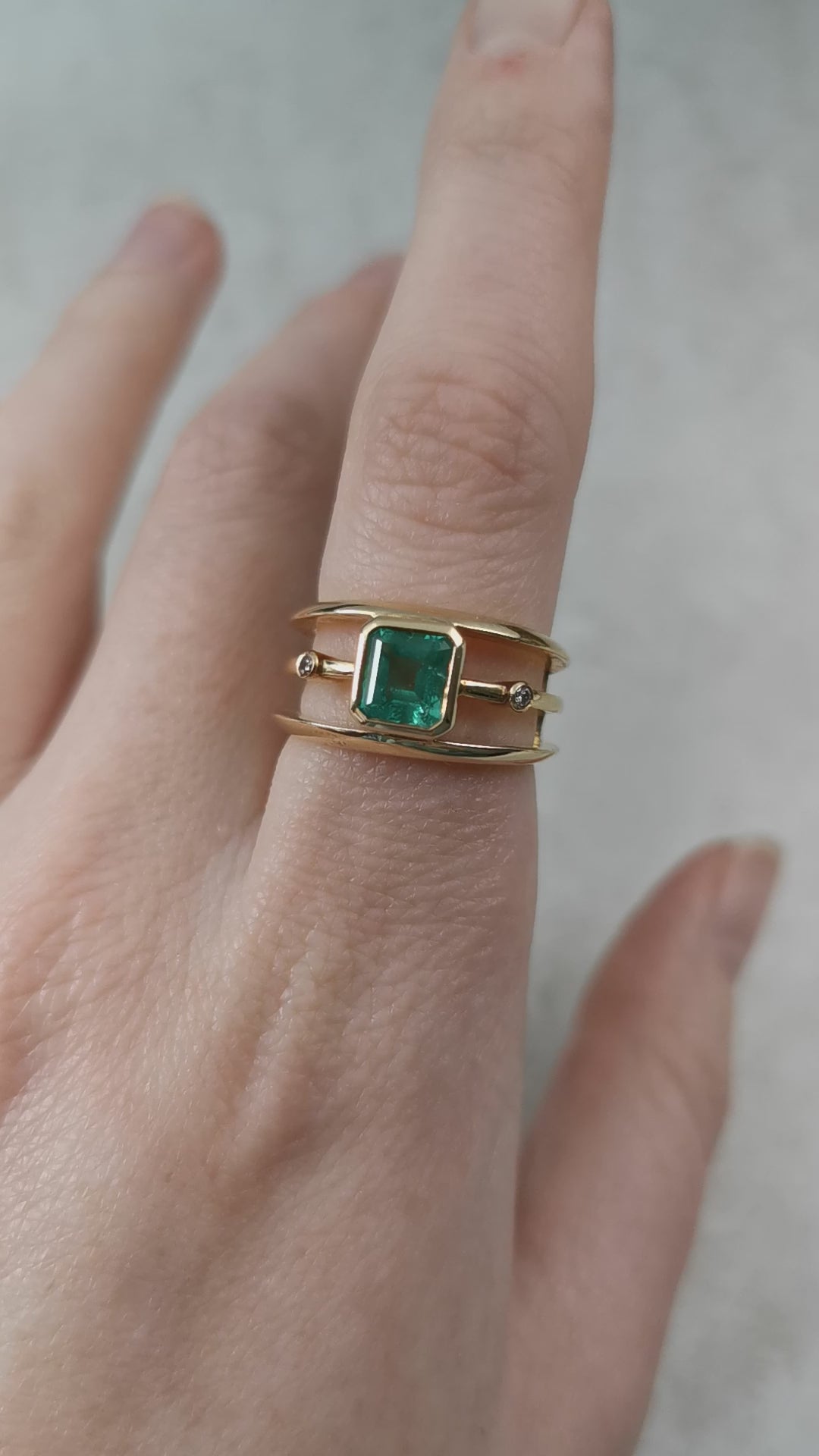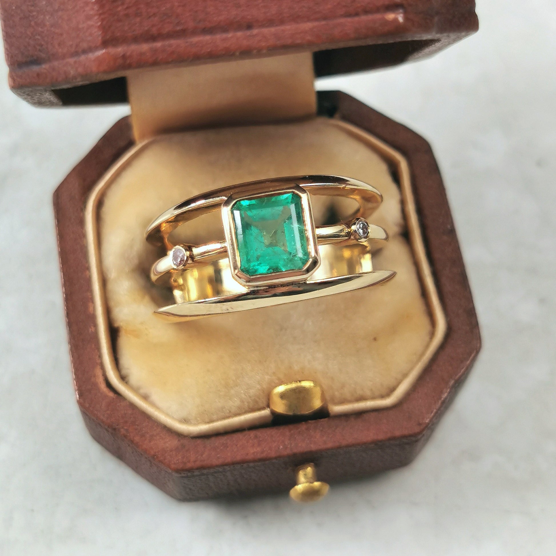 Estate ring constructed out of solid 18k yellow gold with genuine emerald and diamonds. A 1m wide ring consists of 3 bands spaced apart from each other and connecting in the back (5 mm wide). Ring rises 6mm off finger. Custom, jeweller made ring to beautifully showcases bright emerald.