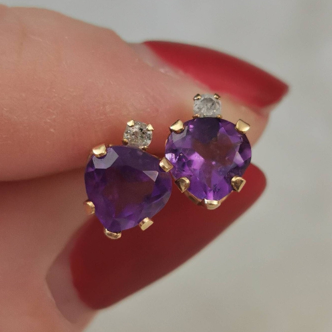 Estate 10k Yellow Gold Amethyst Heart and Diamond Studs