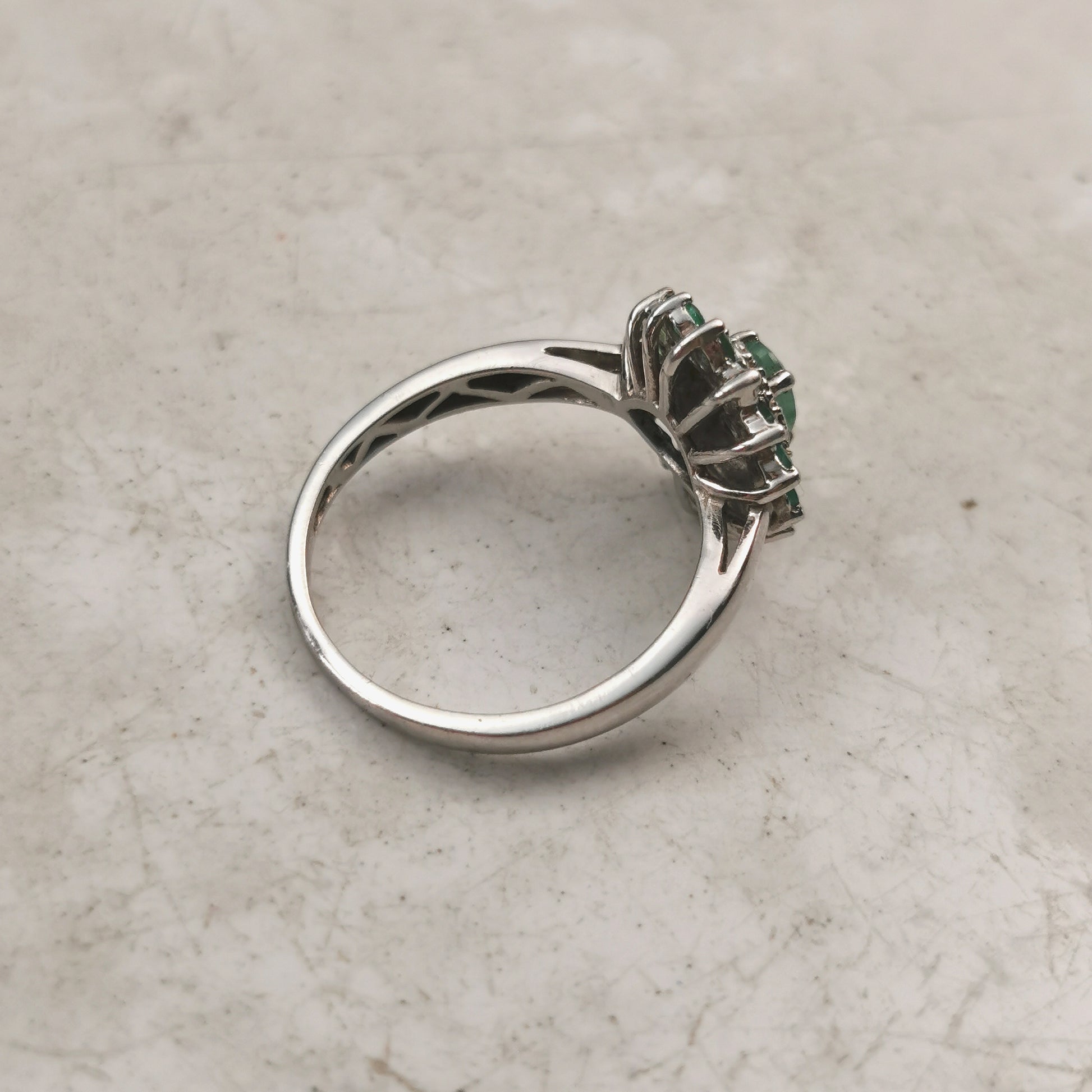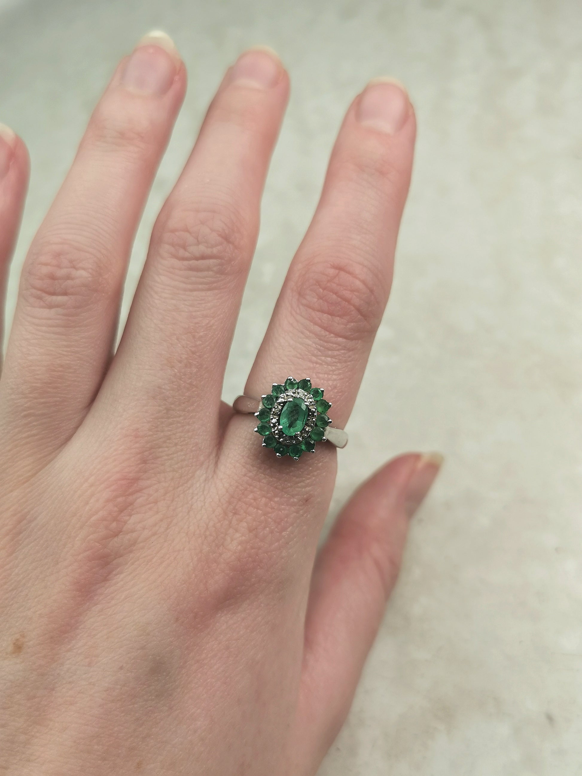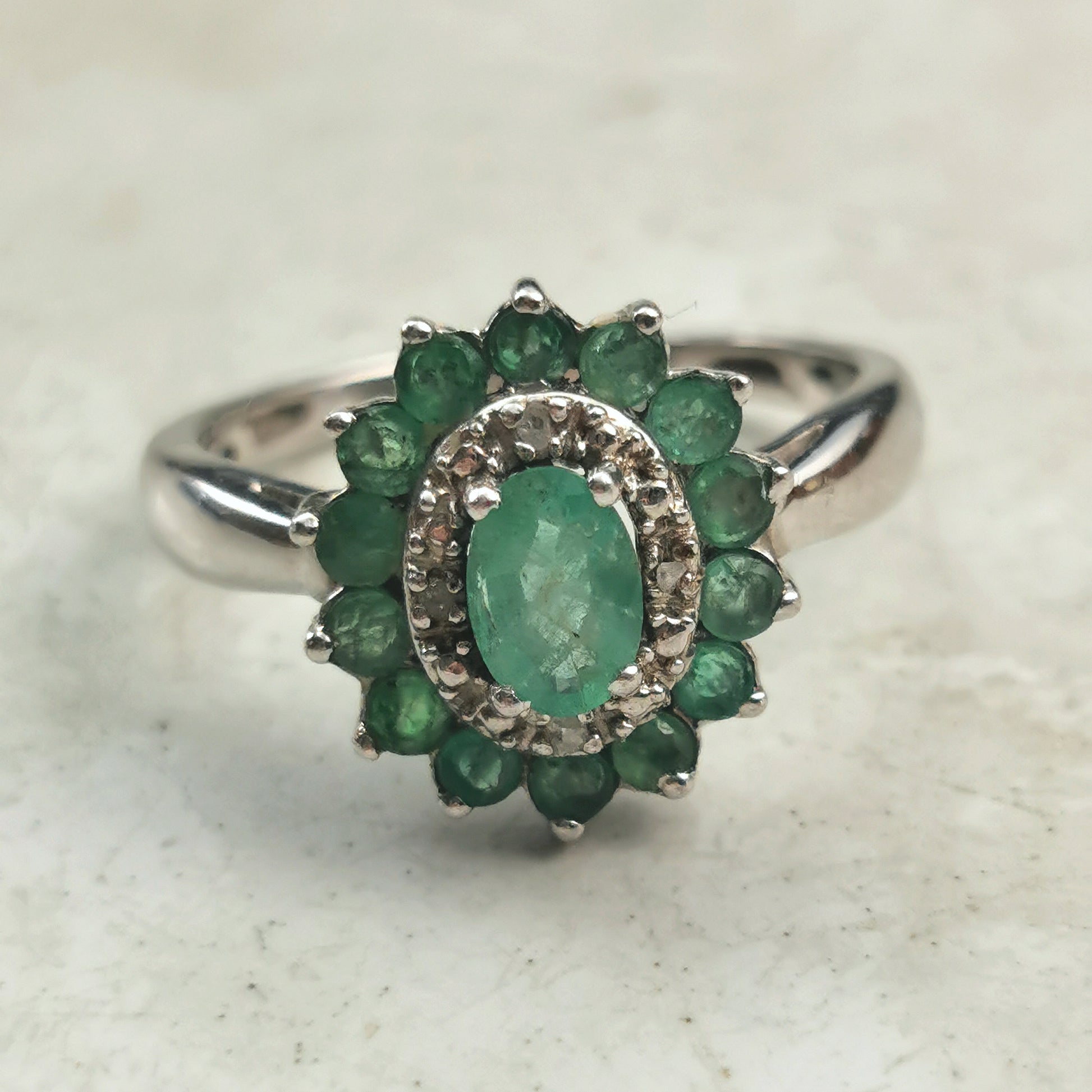 Estate cluster ring constructed out of solid sterling silver with genuine emeralds and diamonds. An oval mixed cut emerald measuring 5.97mm long x 4mm wide is claw set at centre of ring. Two diamond chips are set above and below oval emerald. Halo has fourteen approx. 2.2mm each emeralds.