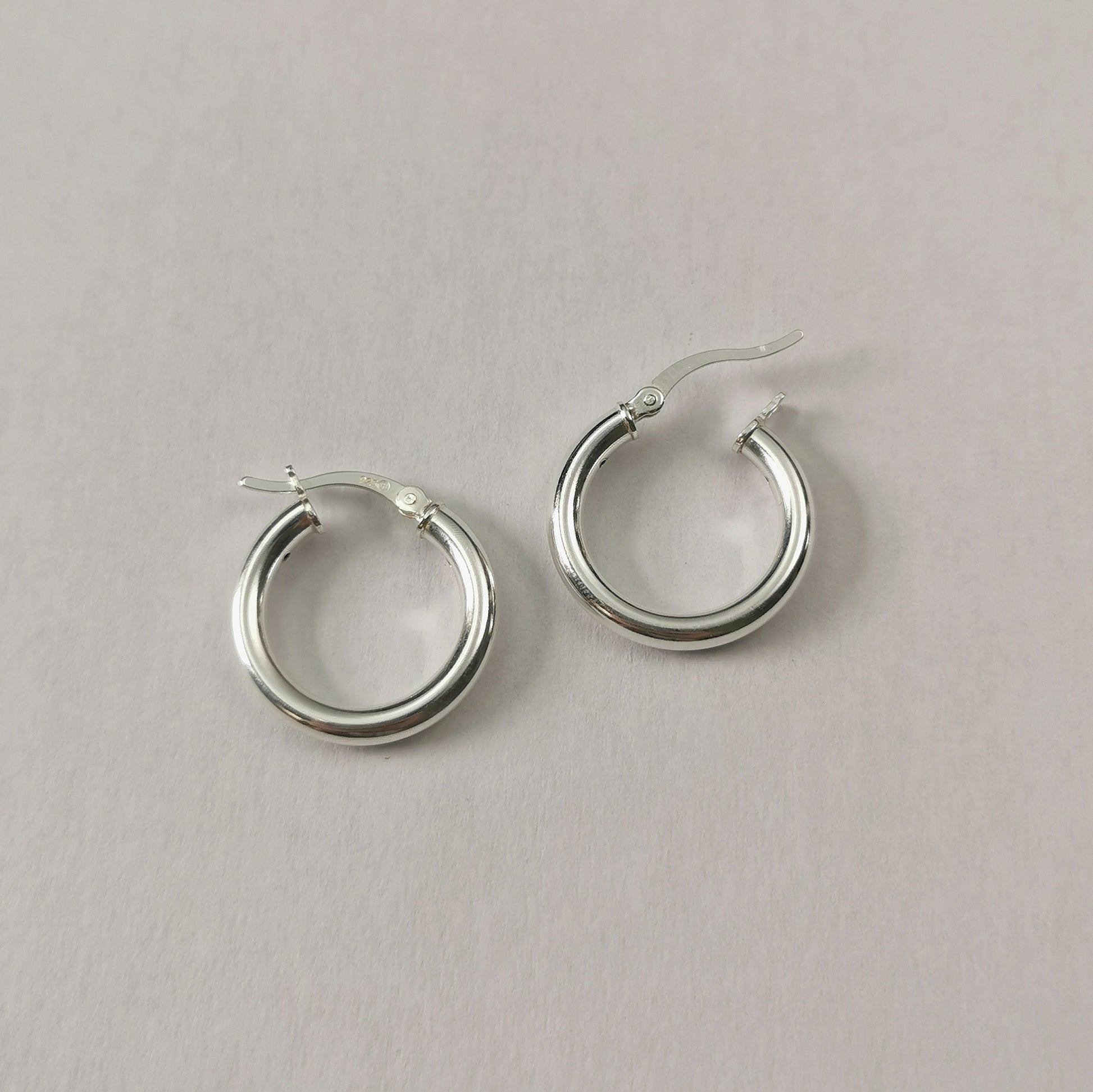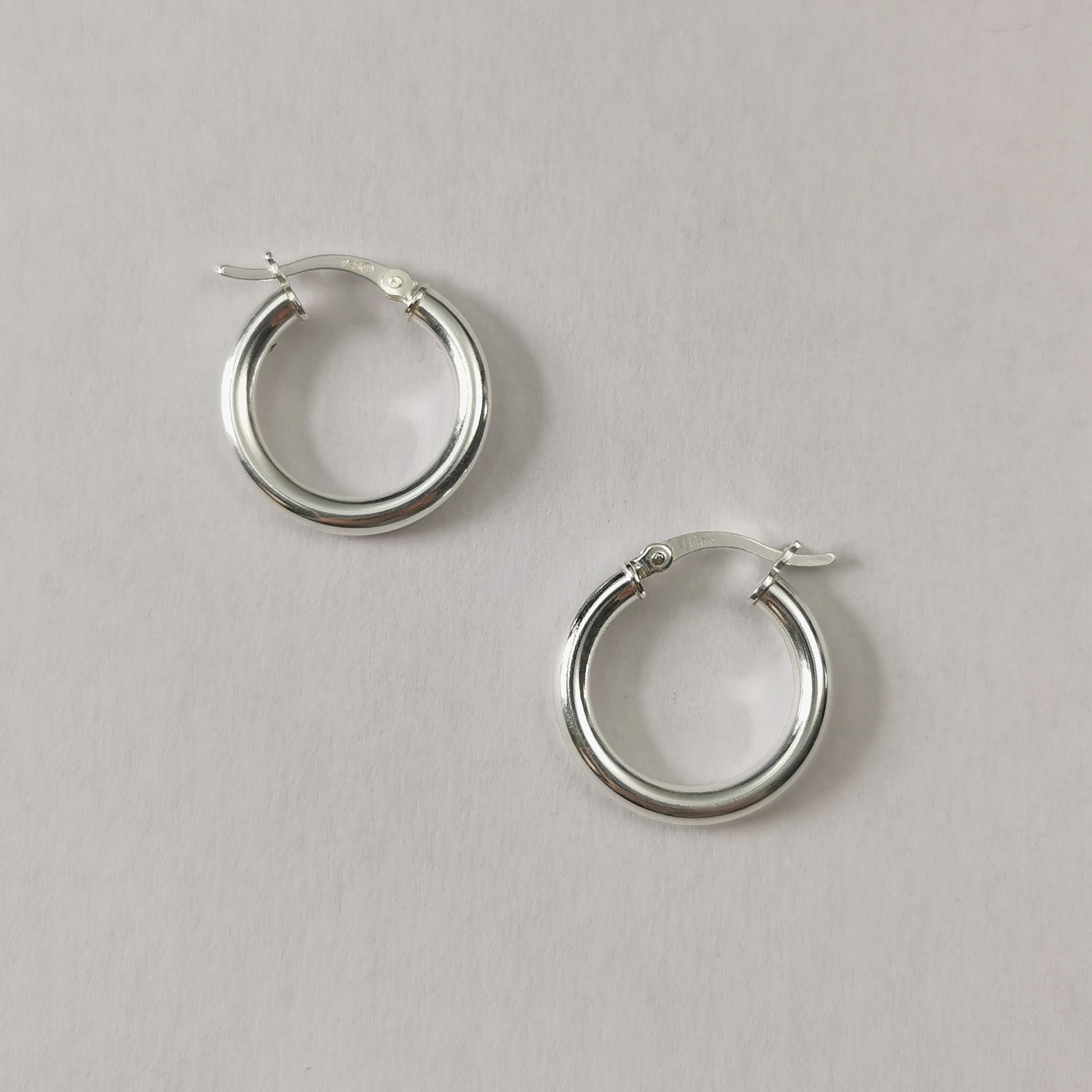 New hoops constructed out of sterling silver with rhodium plating. 3mm wide hollow (but heavy) tube hoops have a diameter of 2cm.