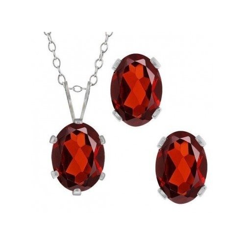 New set consisting of a pair of stud earrings with a pendant on chain, constructed out of solid sterling silver with genuine garnet.