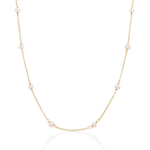 New chain constructed out of solid sterling silver with gold plating and genuine fresh water pearls. Fresh water pearls of approx. 3mm wide x 2mm long are station among a find cable link chain.