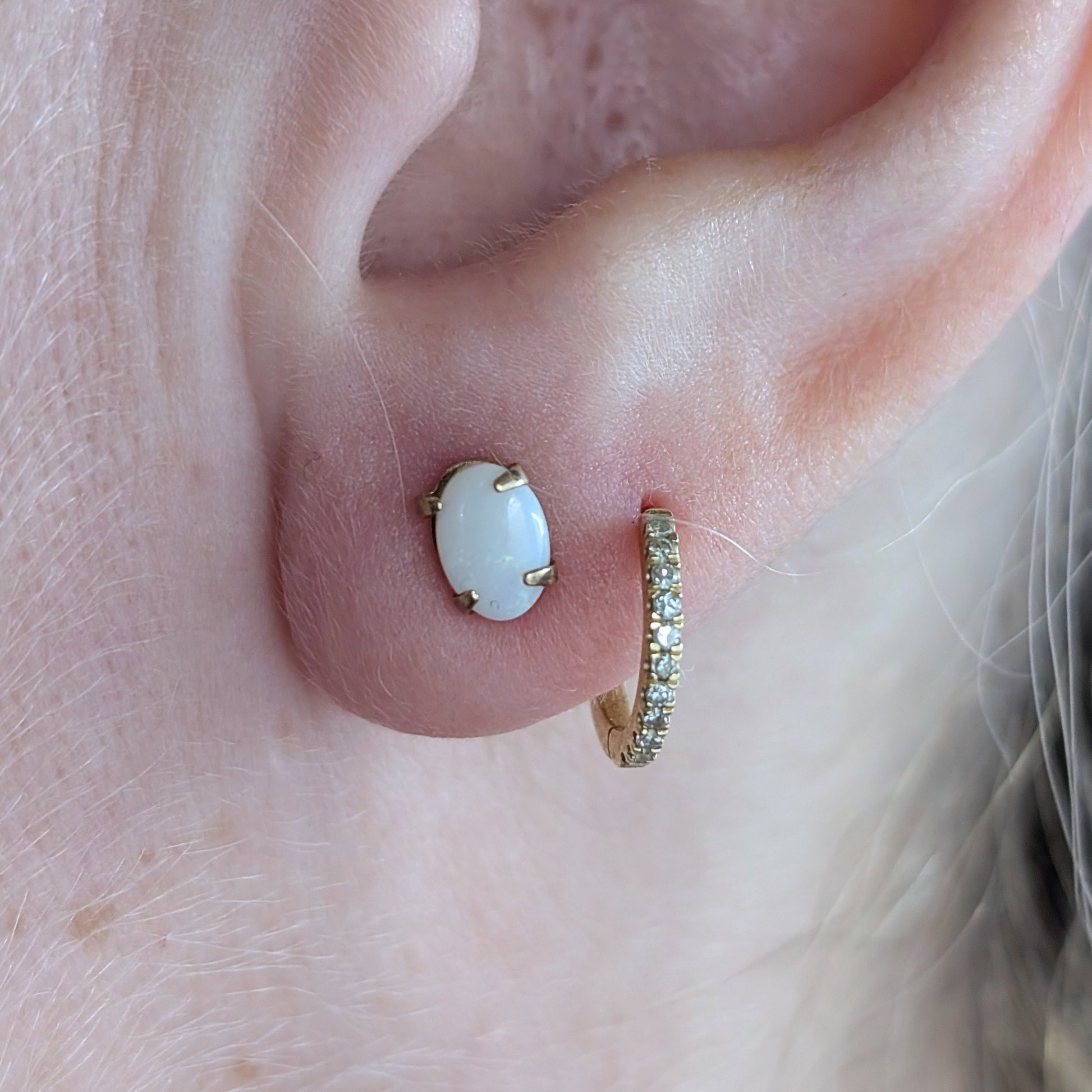 - studs are constructed of solid 10k yellow gold with genuine opal, one butterfly back is constructed of solid sterling silver with 14k gold overlay