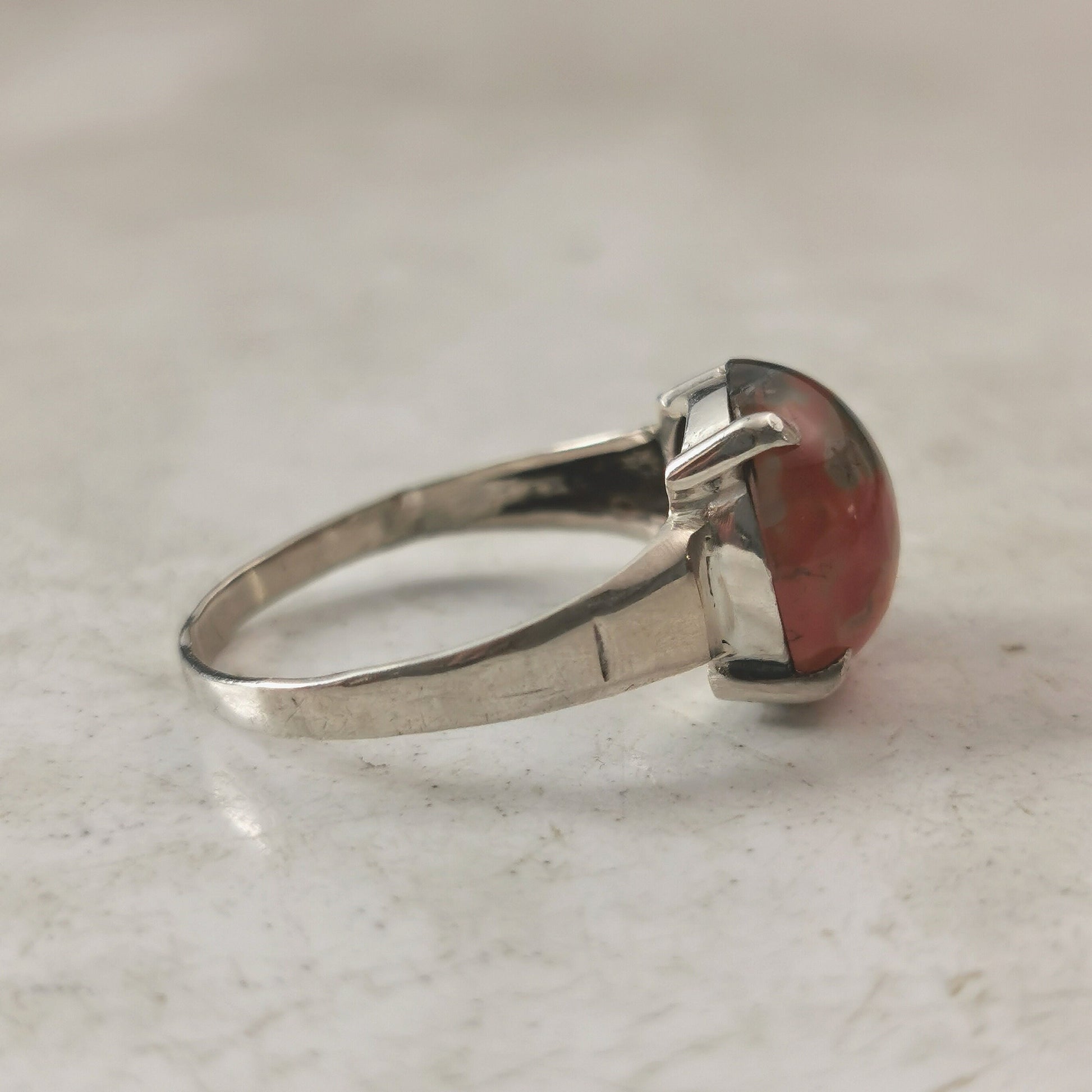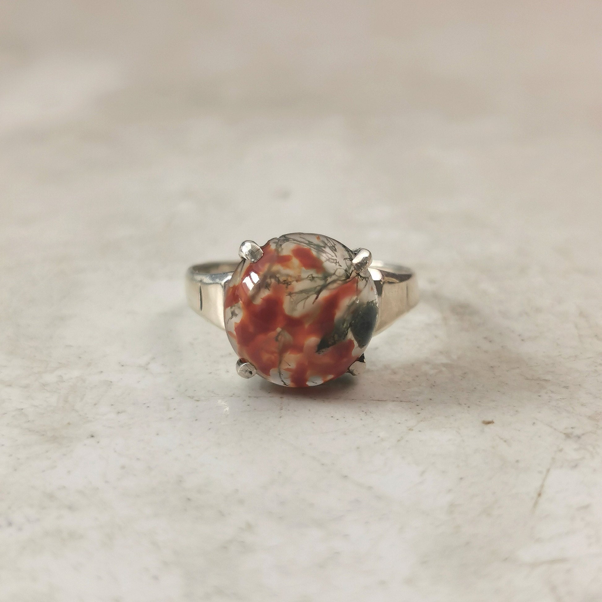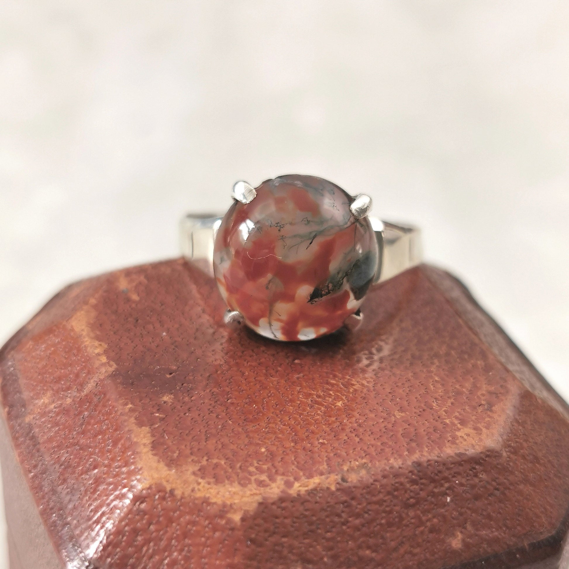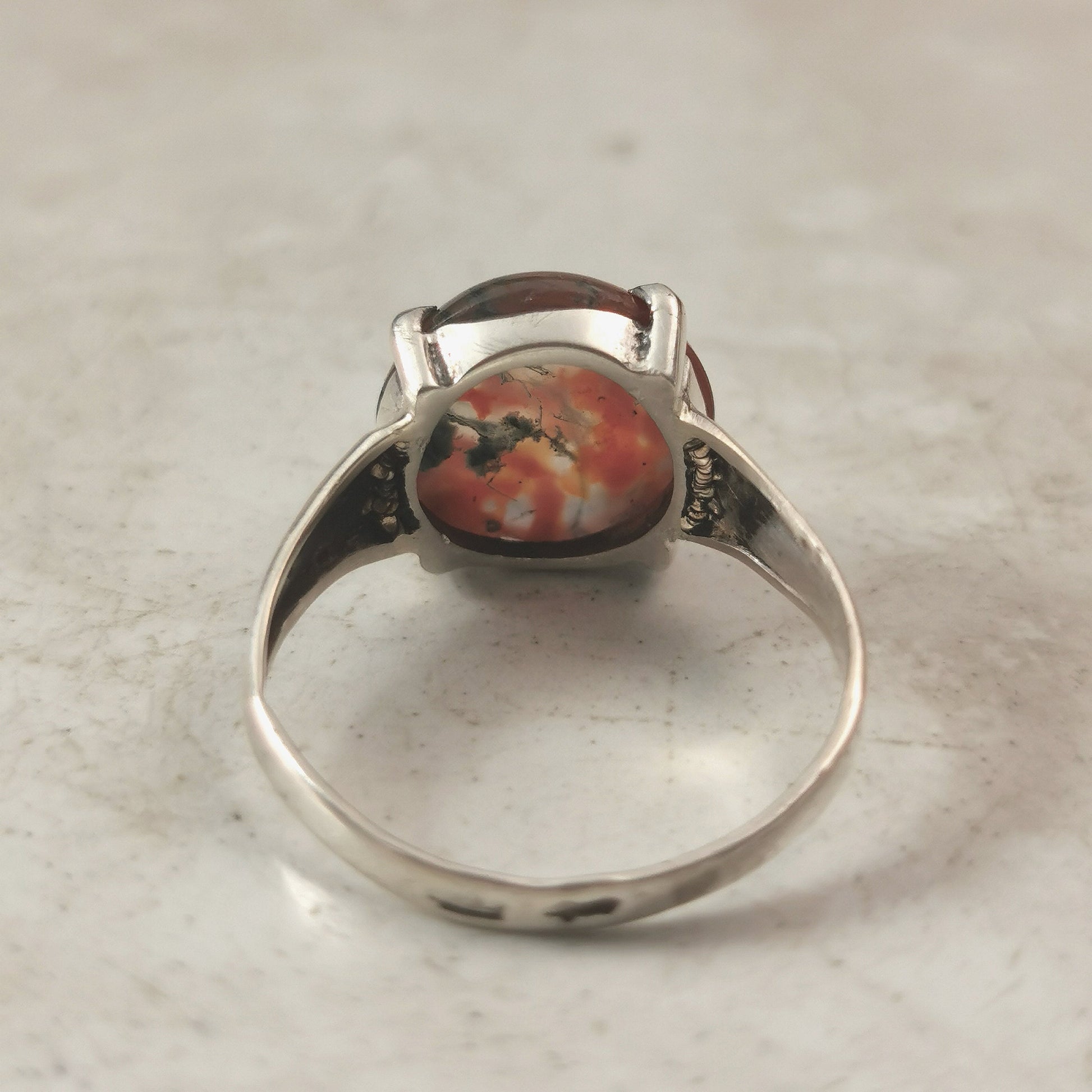 This ring is a conversion (or marriage) piece assembled by my jeweller from a 1920s sterling silver and moss agate stick pin & the shank of a vintage 835 silver ring. The ring now features a round moss agate cabochon measuring 10.2mm in diameter and showing reddish-oranges and mossy greens. The stone has a few nicks around edges that are only visible under close observation and are consistent with age. Shoulders have a single line engraved on each and taper to a 1.8mm wide band at back. The face of ring is 1.1cm long and rises 5mm off finger.