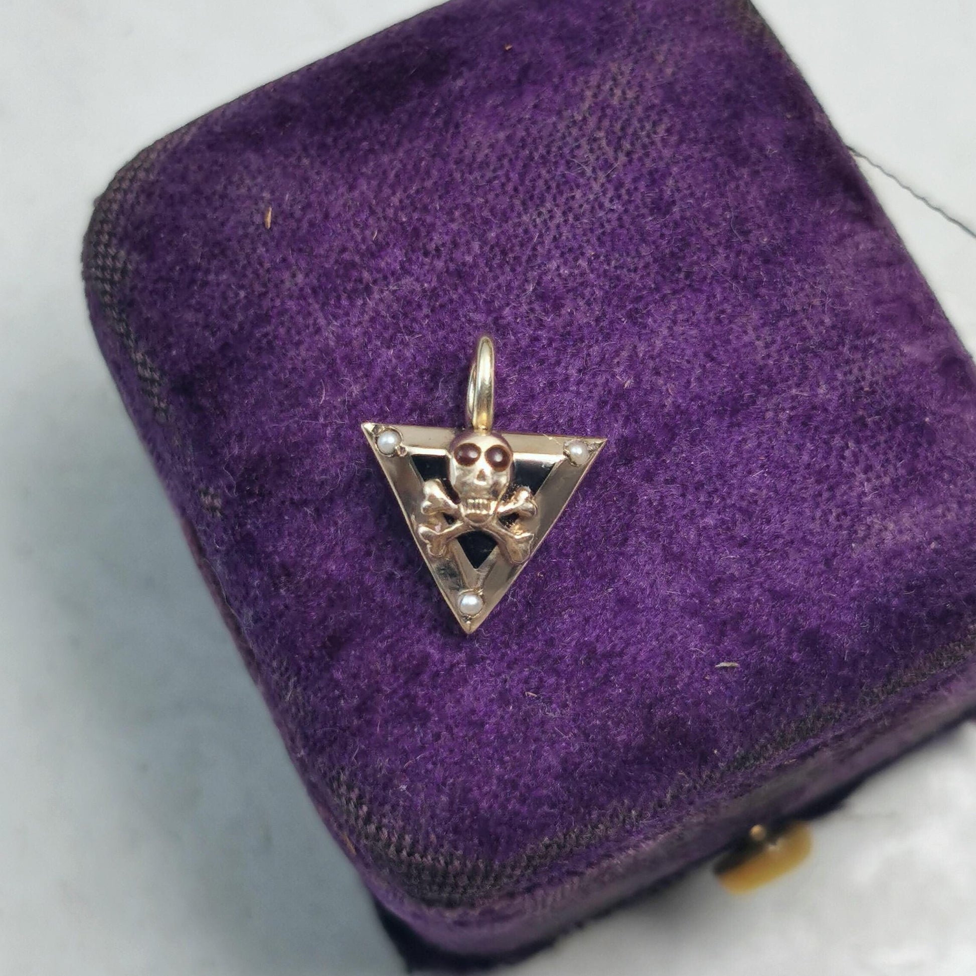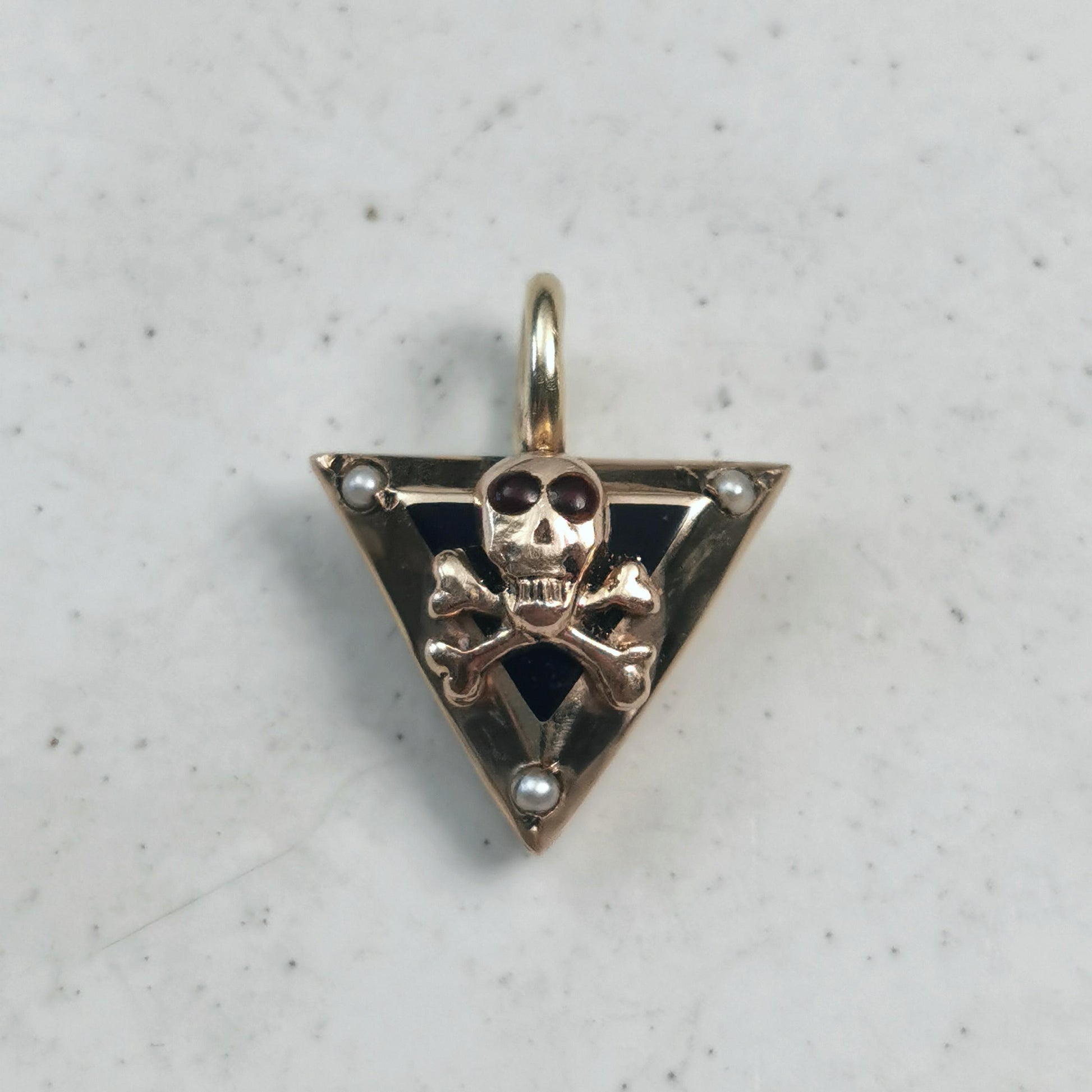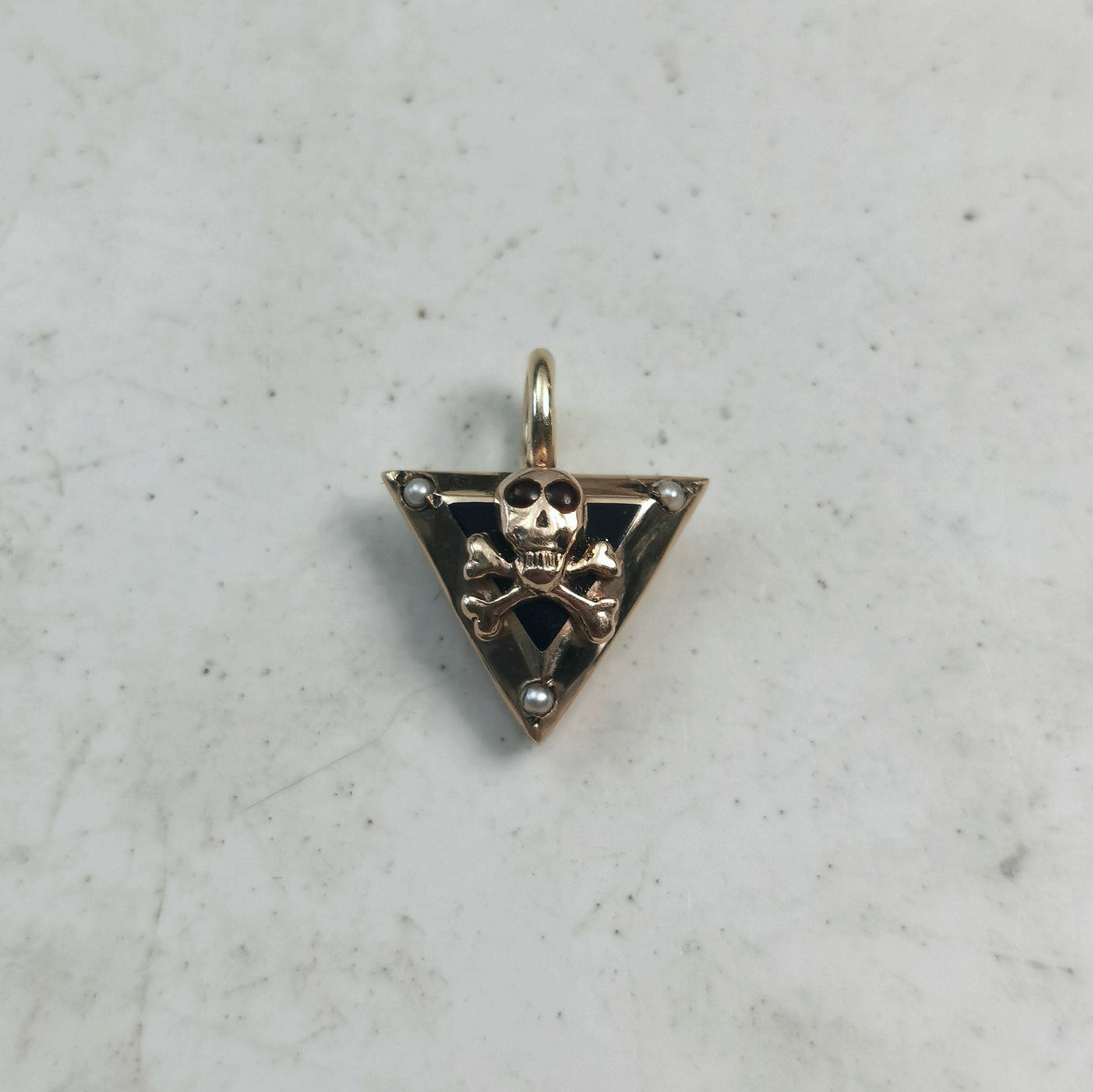 - this pendant features a skull with ruby eyes and crossbones over of black enamel triangle, with a seed pearl set into each corner of the triangle