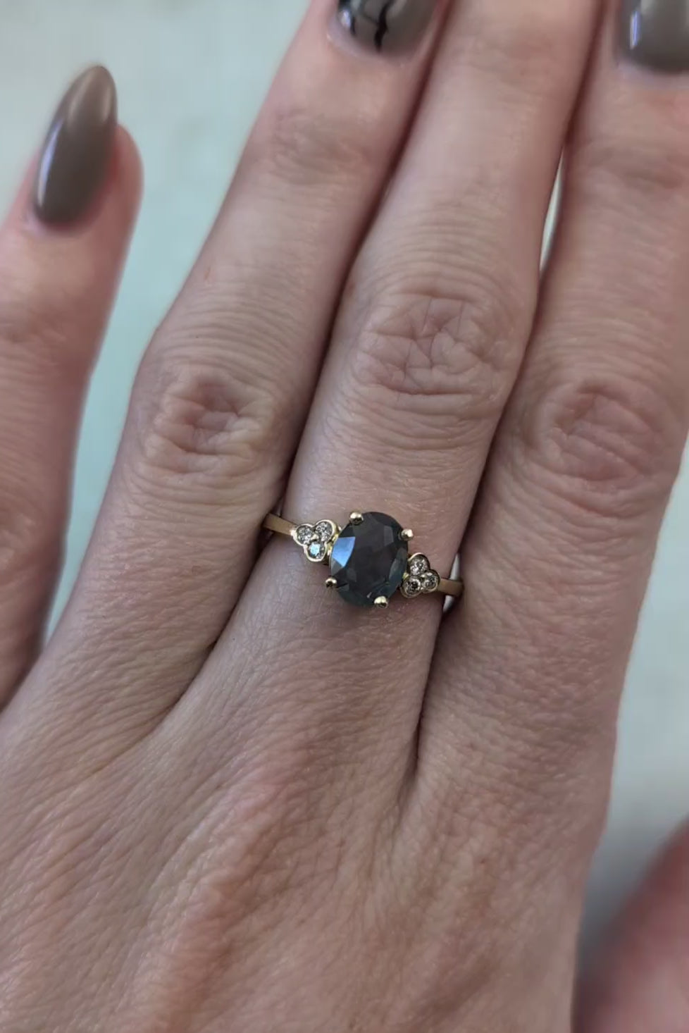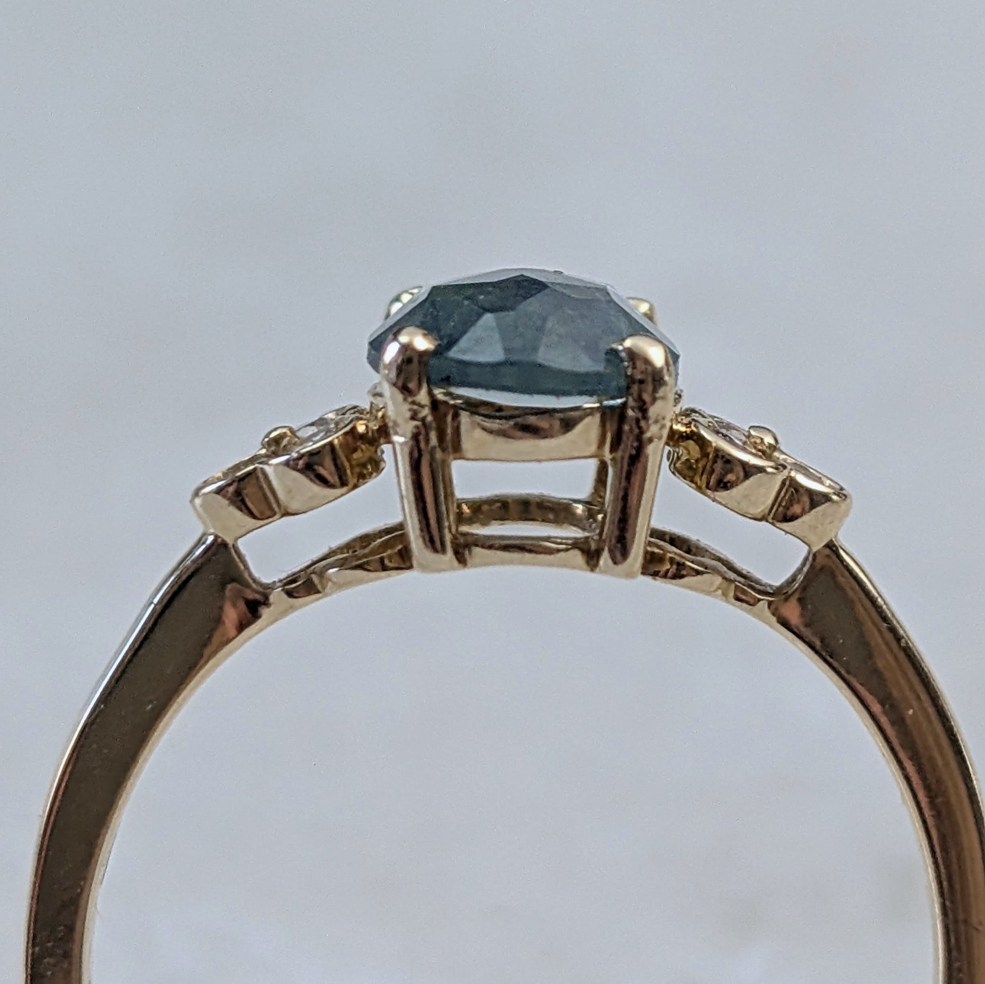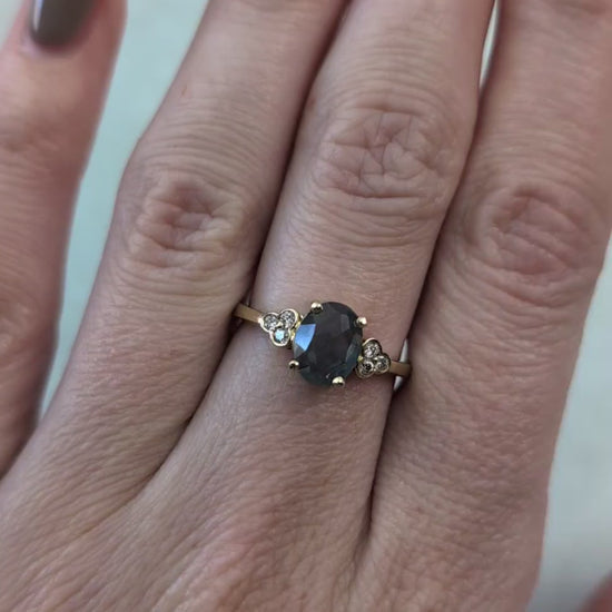 - ring features a 1ct (8mm x 6.3mm) oval rose cut teal Sapphire mined in Montana USA