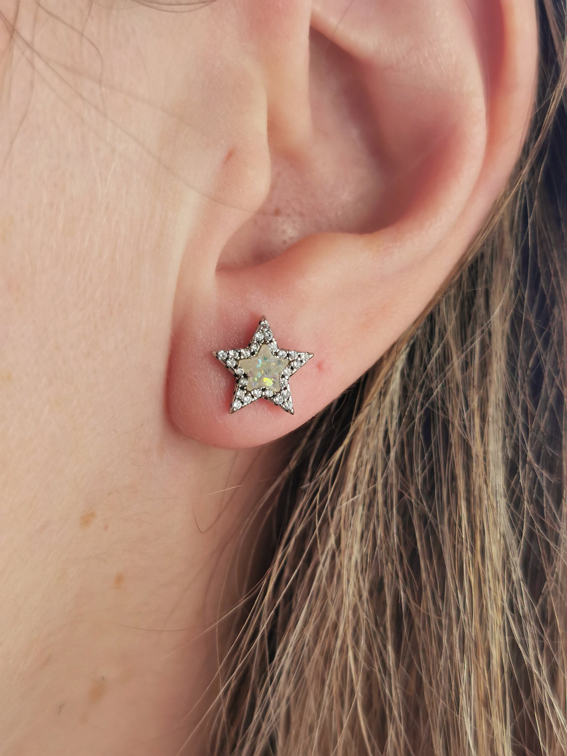 Estate stud earrings constructed out of solid sterling silver, cubic zirconia and plastic. A halo of CZs surround a plastic faux opal star in the centre.