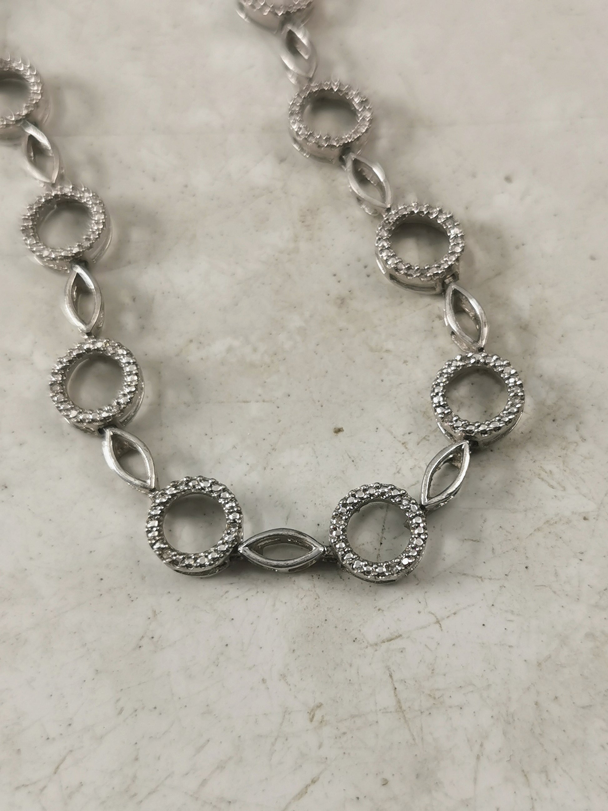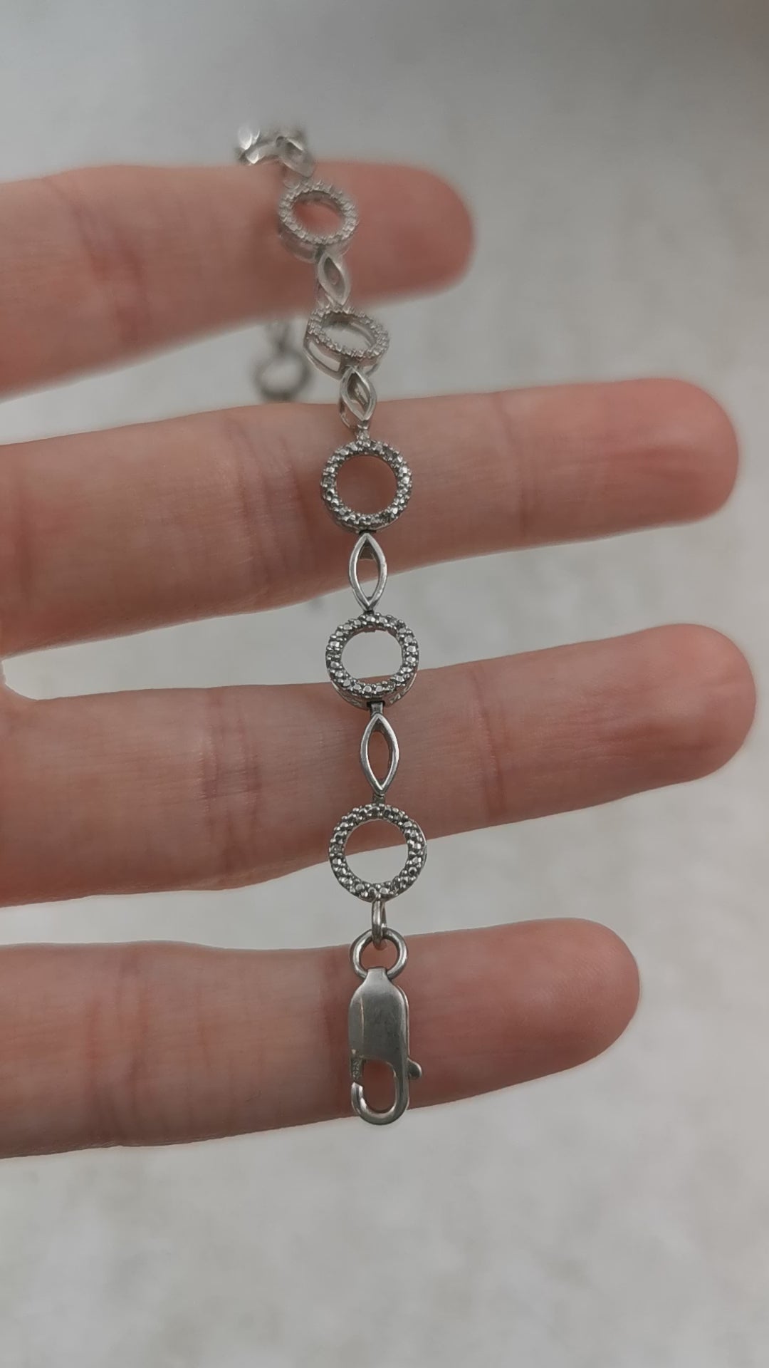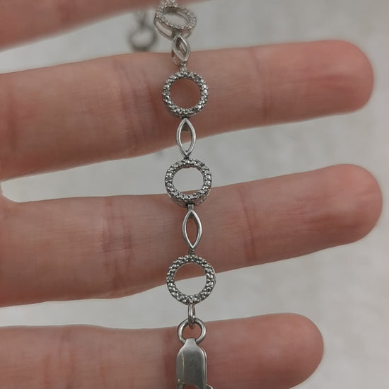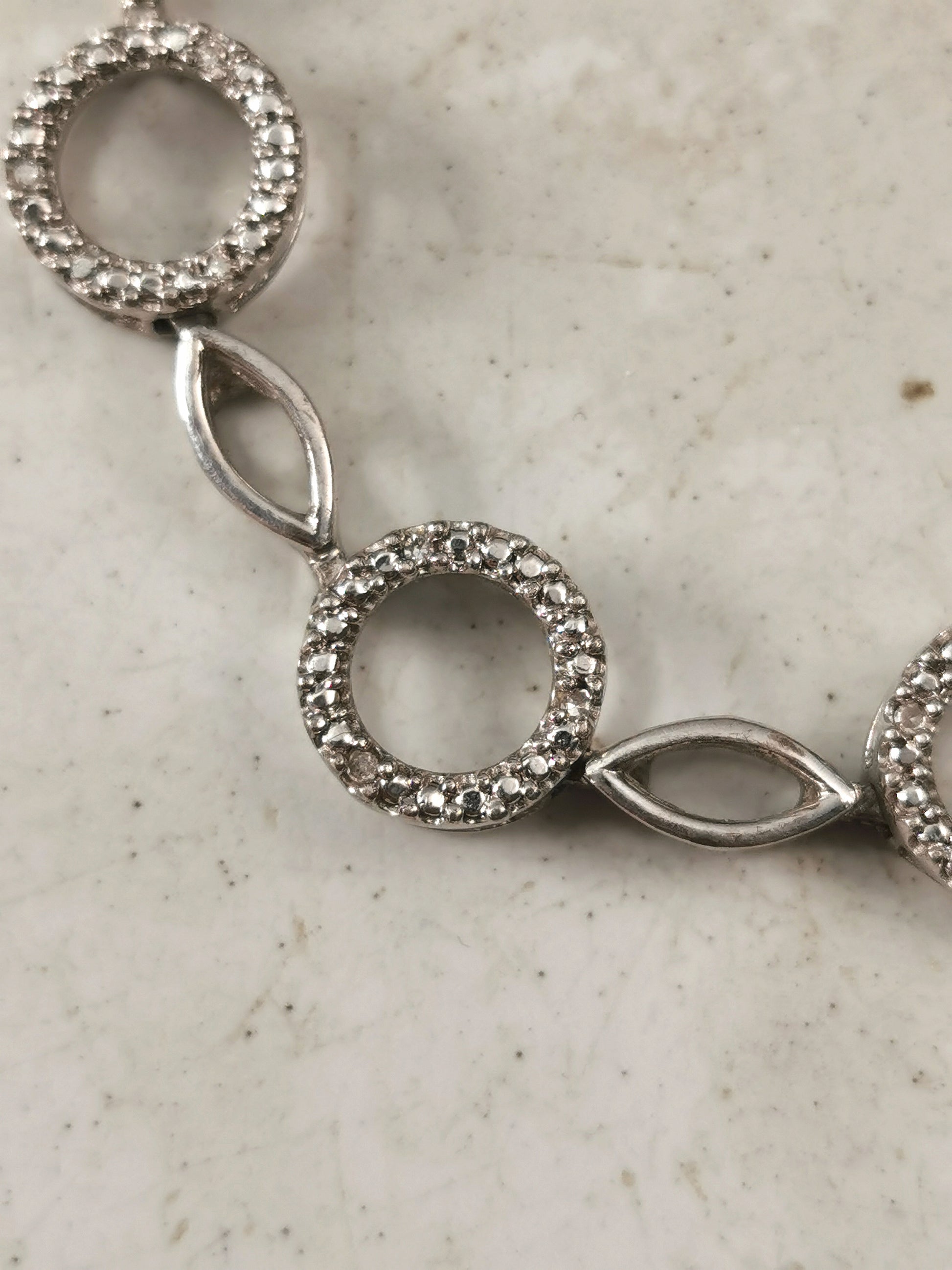 Estate bracelet constructed of solid sterling silver and genuine diamonds. Bracelet consists of circle links interspersed with navette shaped links. Each circle link has three 0.005ct single cut diamonds for